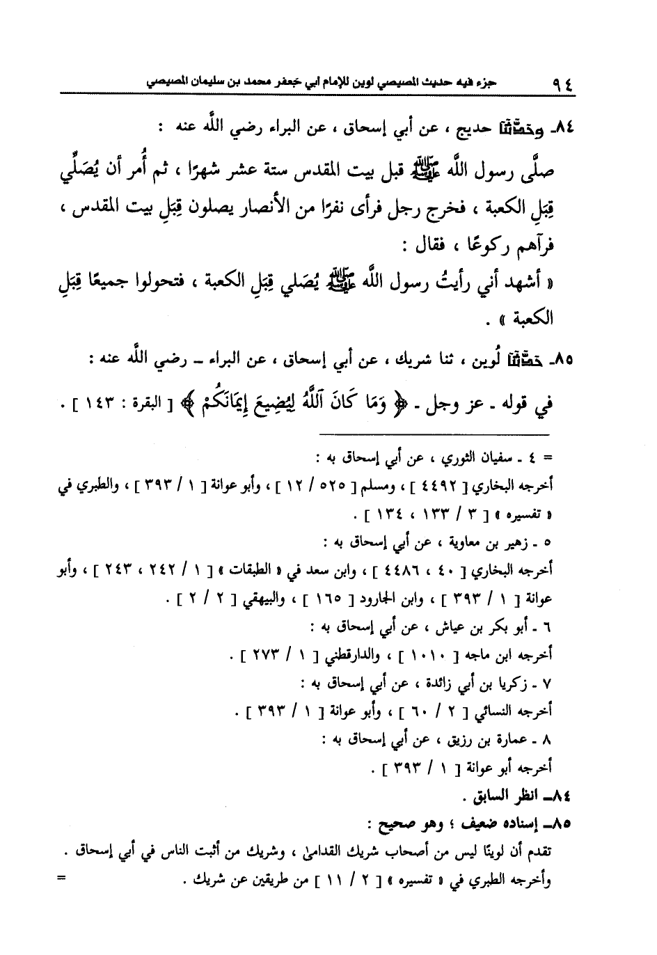 84 - ونا حُدَيْجٌ، عَنْ أَبِي إِسْحَاقَ، عَنِ الْبَرَاءِ، رَضِيَ اللَّهُ عَنْهُ: §صَلَّى رَسُولُ اللَّهِ صَلَّى اللهُ عَلَيْهِ وَسَلَّمَ قِبَلَ بَيْتِ الْمَقْدِسِ سِتَّةَ عَشَرَ شَهْرًا، ثُمَّ أُمِرَ أَنْ يُصَلِّيَ قِبَلَ الْكَعْبَةِ، فَخَرَجَ رَجُلٌ فَرَأَى نَفَرًا مِنَ الْأَنْصَارِ يُصَلُّونَ قِبَلَ بَيْتِ الْمَقْدِسِ فَرَآهُمْ رَكَعُوا فَقَالَ: إِنِّي أَشْهَدُ أَنِّي رَأَيْتُ رَسُولَ اللَّهِ صَلَّى اللهُ عَلَيْهِ وَسَلَّمَ يُصَلِّي قِبَلَ الْكَعْبَةِ، فَتَوَلُّوا جَمِيعًا قِبَلَ الْكَعْبَةِ