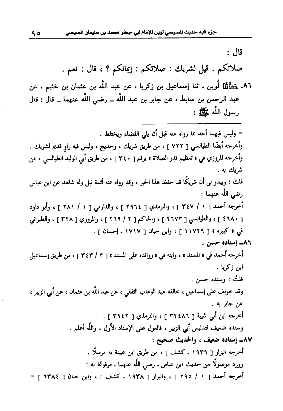 86 - حَدَّثَنَا إِسْمَاعِيلُ بْنُ زَكَرِيَّا، عَنْ عَبْدِ اللَّهِ بْنِ عُثْمَانَ بْنِ خُثَيْمٍ، عَنْ عَبْدِ الرَّحْمَنِ بْنِ سَابِطٍ، عَنْ جَابِرِ بْنِ عَبْدِ اللَّهِ رَضِيَ اللَّهُ عَنْهُمَا، قَالَ: قَالَ رَسُولُ اللَّهِ صَلَّى اللهُ عَلَيْهِ وَسَلَّمَ -[96]- «اللَّهُمَّ §اهْدِ ثَقِيفًا»