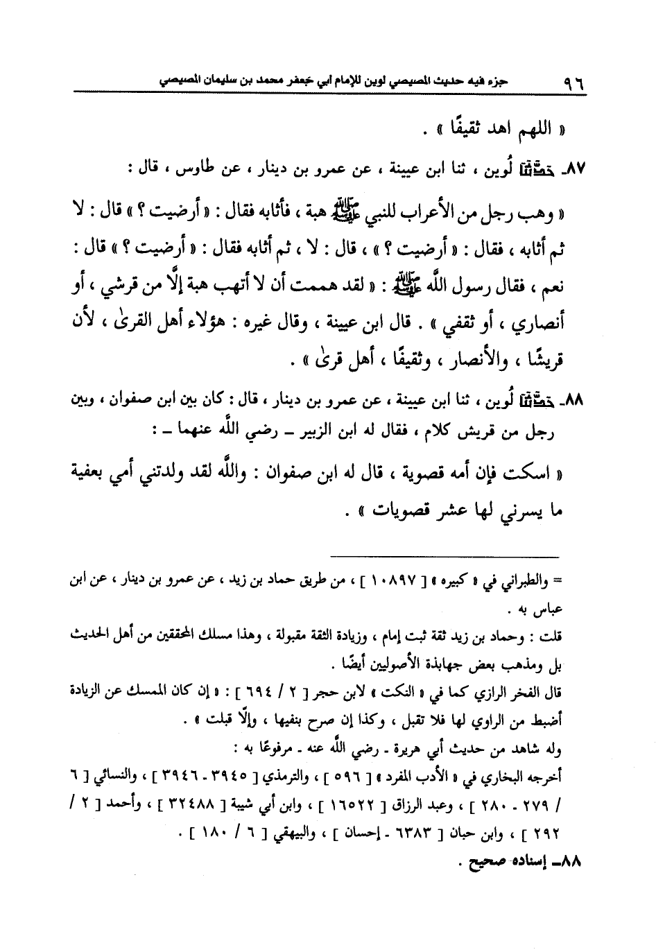 87 - حَدَّثَنَا ابْنُ عُيَيْنَةَ، عَنْ عَمْرِو بْنِ دِينَارٍ، عَنْ طَاوُسٍ، قَالَ: وَهَبَ رَجُلٌ مِنَ الْأَعْرَابِ لِلنَّبِيِّ صَلَّى اللهُ عَلَيْهِ وَسَلَّمَ هِبَةً فَأَثَابَهُ، فَقَالَ: «أَرَضِيتَ» ؟ قَالَ: لَا. ثُمَّ أَثَابَهُ. فَقَالَ: «أَرَضِيتَ» ؟ قَالَ: لَا. ثُمَّ أَثَابَهُ. فَقَالَ: «أَرَضِيتَ» ؟ قَالَ: نَعَمْ فَقَالَ رَسُولُ اللَّهِ صَلَّى اللهُ عَلَيْهِ وَسَلَّمَ: «§لَقَدْ هَمَمْتُ أَلَّا أَتَّهِبَ هِبَةً إِلَّا مِنْ قُرَشِيٍّ، أَوْ أَنْصَارِيٍّ، أَوْ ثَقَفِيٍّ» قَالَ ابْنُ عُيَيْنَةَ وَقَالَ غَيْرُهُ: هَؤُلَاءِ أَهْلُ قُرَى قَالَ ابْنُ عُيَيْنَةَ لِأَنَّ قُرَيْشًا وَالْأَنْصَارَ وَثَقِيفًا أَهْلُ قُرًى