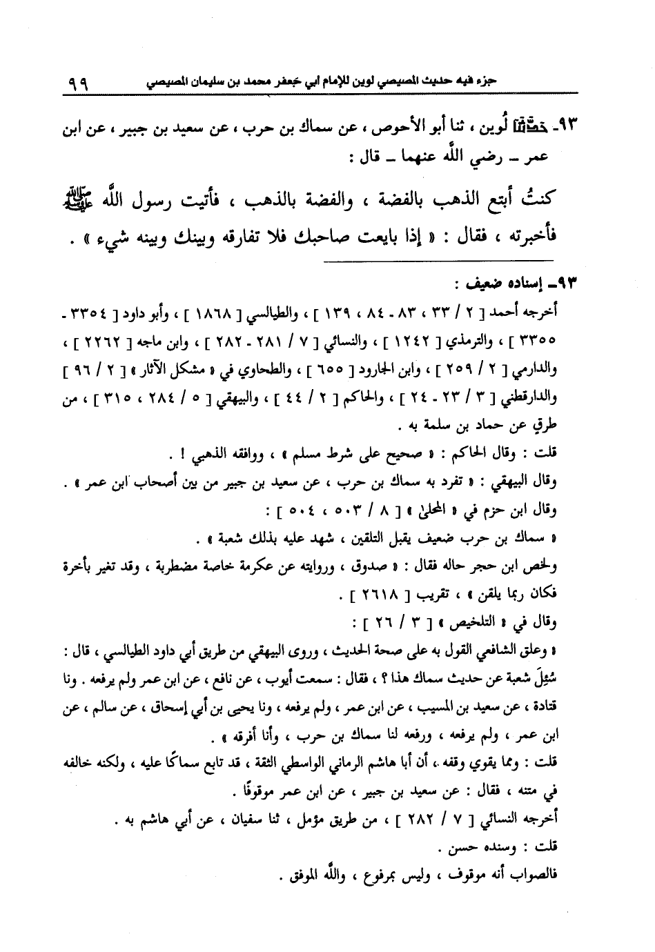 93 - حَدَّثَنَا أَبُو الْأَحْوَصِ، عَنْ سِمَاكِ بْنِ حَرْبٍ، عَنْ سَعِيدِ بْنِ جُبَيْرٍ، عَنِ ابْنِ عُمَرَ رَضِيَ اللَّهُ عَنْهُمَا، قَالَ: كُنْتُ أَبِيعُ الذَّهَبَ بِالْفِضَّةِ، وَالْفِضَّةَ بِالذَّهَبِ، فَأَتَيْتُ رَسُولَ اللَّهِ صَلَّى اللهُ عَلَيْهِ وَسَلَّمَ فَأَخْبَرْتُهُ، فَقَالَ: «§إِذَا بَايَعْتَ صَاحِبَكَ فَلَا تُفَارِقْهُ وَبَيْنَكَ وَبَيْنَهُ شَيْءٌ»