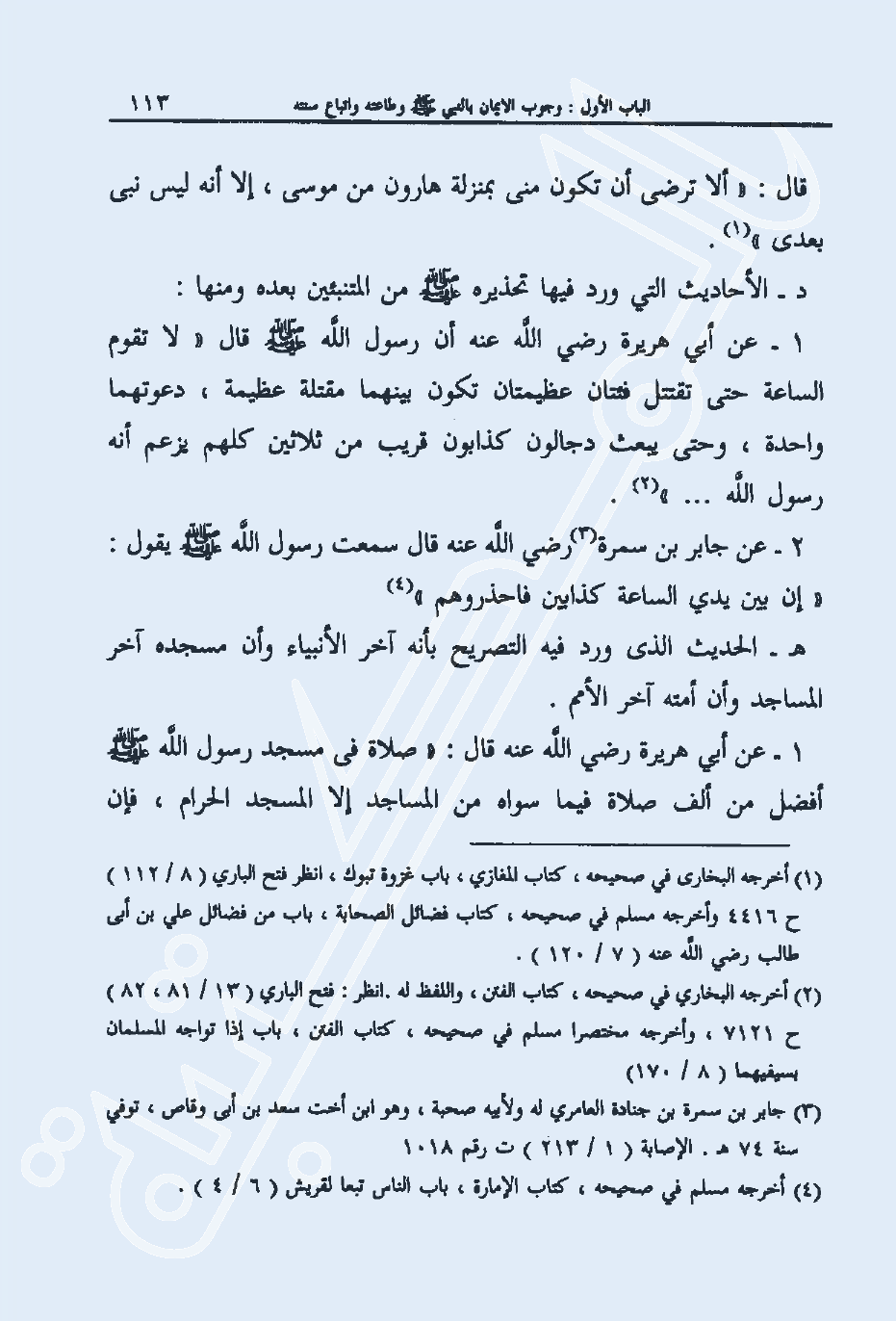 ا- عن أبي هريرة رضي الله عنه أن رسول صلى الله عليه وسلم قال: "لا تقوم الساعة حتى تقتتل فئتان عظيمتان تكون بينهما مقتلة عظيمة، دعوتهما واحدة، وحتى يبعث دجالون كذابون قريب من ثلاثين كلهم يزعم أنه رسول الله.." 2