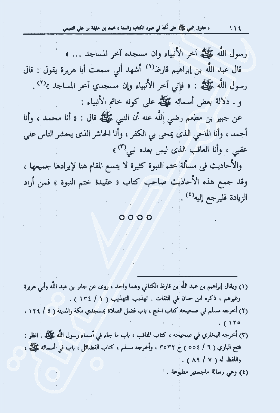 قال عبد الله بن إبراهيم قارظ1 أشهد أني سمعت أبا هريرة يقول: قال رسول الله صلى الله عليه وسلم: "فإني آخر الأنبياء وإن مسجدي آخر المساجد" 2.