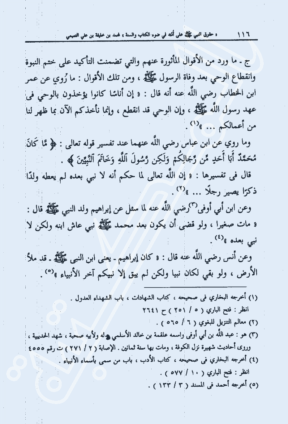 وعن ابن أبي أوفى3 رضي الله عنه لما سئل عن إبراهيم ولد النبي صلى الله عليه وسلم قال: "مات صغيرا، ولو قضى أن يكون بعد محمد صلى الله عليه وسلم نبي عاش ابنه ولكن لا نبي بعده"4.