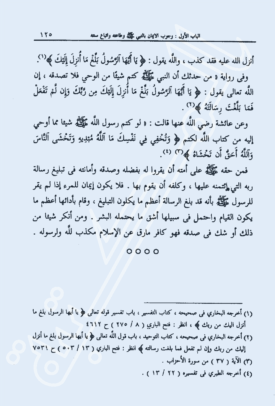 2 أخرجه البخاري في صحيحه، كتاب التوحيد: باب قول الله تعالى {يَا أَيُّهَا الرَّسُولُ بَلِّغْ مَا أُنْزِلَ إِلَيْكَ مِنْ رَبِّكَ وَإِنْ لَمْ تَفْعَلْ فَمَا بَلَّغْتَ رِسَالَتَهُ} ، انظر: فتح الباري (13/ 503) ح 7531.