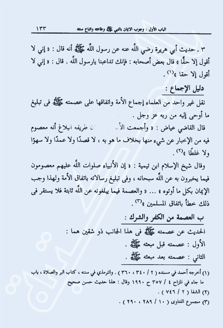 وقال شيخ الإسلام ابن تيمية: "إن الأنبياء صلوات الله عليهم معصومون فيما يخبرون به عن الله سبحانه، وفى تبليغ رسالاته باتفاق الأمة ولهذا وجب الإيمان بكل ما أوتوه..... والعصمة فيما يبلغونه عن الله ثابتة فلا يستقر في ذلك خطأ باتفاق المسلمين"3