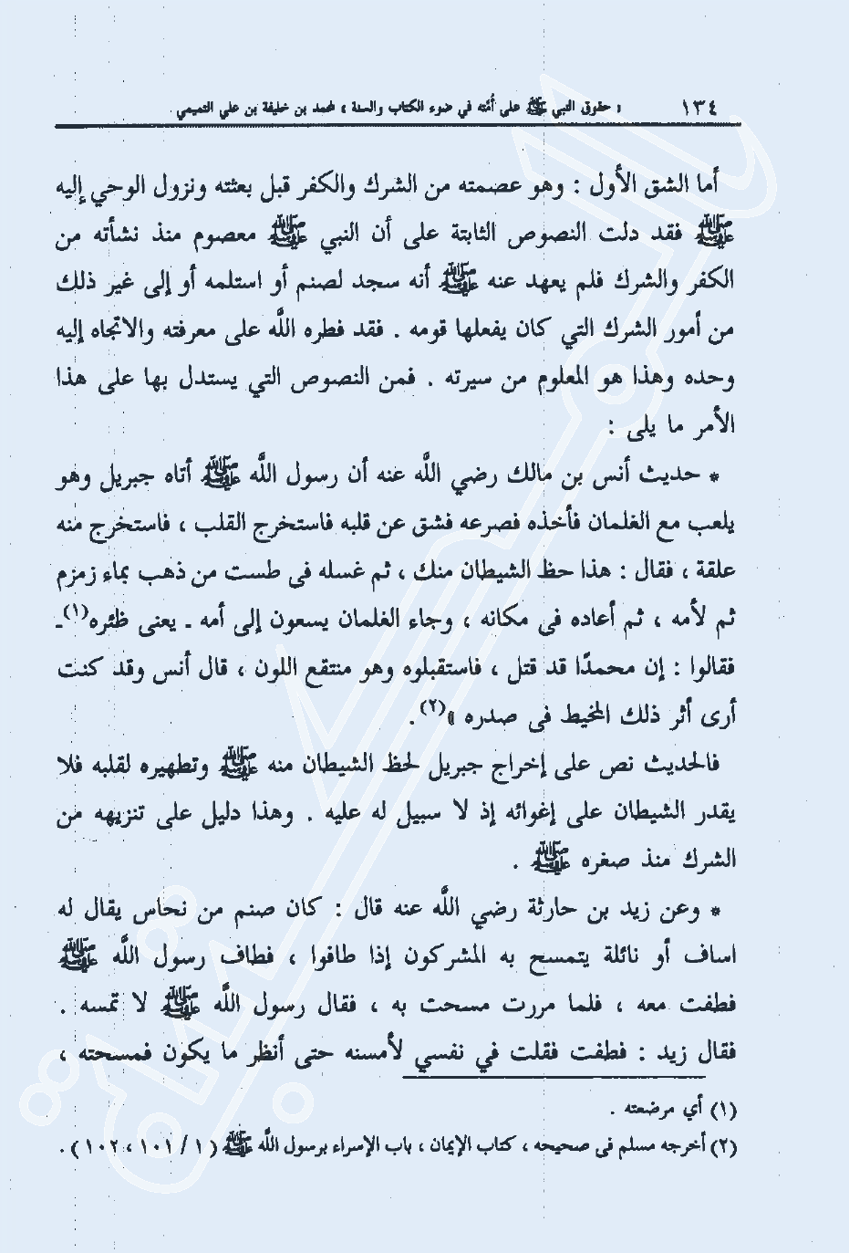 فالحديث نص على إخراج جبريل لحظ الشيطان منه صلى الله عليه وسلم وتطهيره لقلبه فلا يقدر الشيطان على إغوائه إذ لا سبيل له عليه. وهذا دليل على تنزيهه من الشرك منذ صغره صلى الله عليه وسلم.