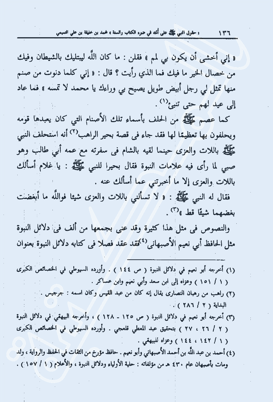 كما عصم صلى الله عليه وسلم من الحلف بأسماء تلك الأصنام التي كان يعبدها قومه ويحلفون بها تعظيما لها فقد جاء في قصة بحيرى الراهب2 أنه استحلف النبي صلى الله عليه وسلم باللات والعزى حينما لقيه بالشام في سفرته مع عمه أبي طالب وهو صبي لما رأى فيه علامات النبوة فقال بحيرى للنبي صلى الله عليه وسلم: يا غلام أسألك باللات والعزى إلا ما أخبرتني عما أسألك عنه، فقال له النبي صلى الله عليه وسلم: "لا تسألني باللات والعزى شيئا فوالله ما أبغضت بغضهما شيئا قط" 3.