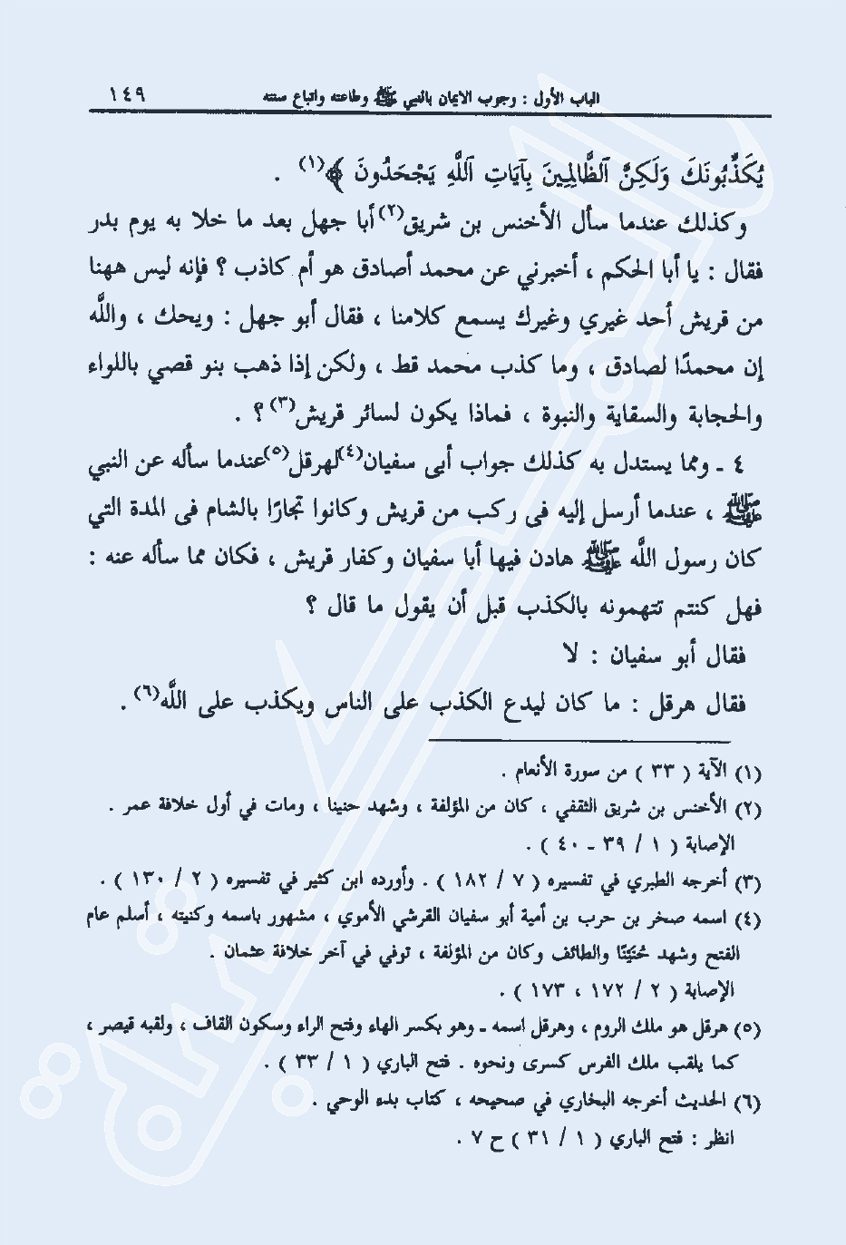 4- ومما يستدل به كذلك جواب أبي سفيان4 لهرقل5 عندما سأله عن النبي صلى الله عليه وسلم، عندما أرسل إليه في ركب من قريش وكانوا تجارا بالشام في المدة التي كان رسول الله صلى الله عليه وسلم هادن فيها أبا سفيان وكفار قريش، فكان مما سأله عنه: فهل كنتم تتهمونه بالكذب قبل أن يقول ما قال؟