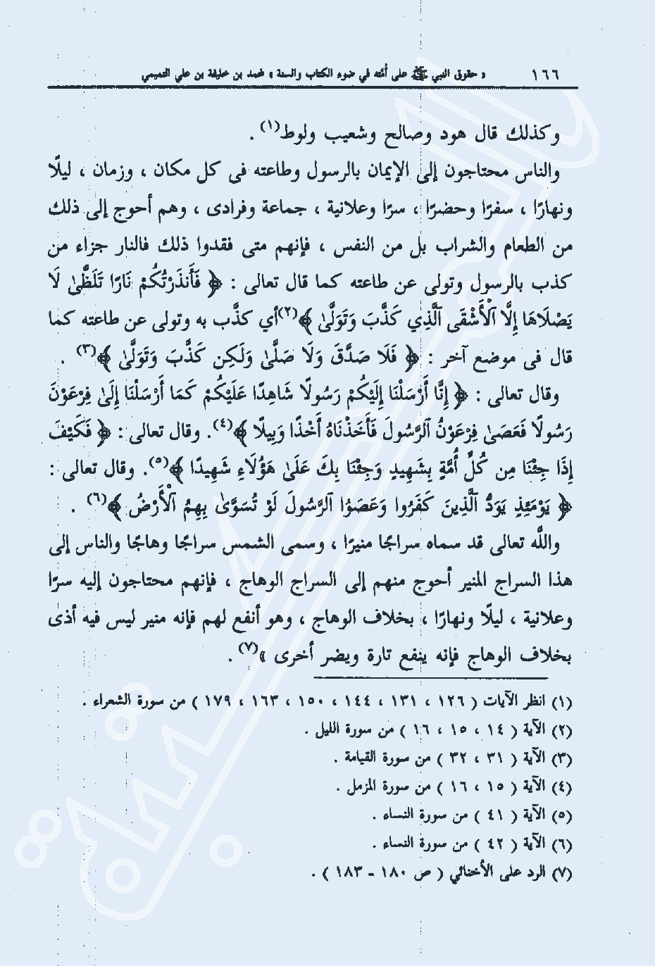 والناس محتاجون إلى الإيمان بالرسول وطاعته في كل مكان، وزمان، ليلا ونهارا، سفرا وحضرا، سرا وعلانية، جماعة وفرادى، وهم أحوج إلى ذلك من الطعام والشراب بل من النفس، فإنهم متى فقدوا ذلك فالنار جزاء من كذب بالرسول وتولى عن طاعته كما قال تعالى: {فَأَنْذَرْتُكُمْ نَاراً تَلَظَّى، لاَ يَصْلاهَا إِلَّا الْأَشْقَى، الَّذِي كَذَّبَ وَتَوَلَّى} 2 أي كذب به وتولى عن طاعته كما قال في موضع آخر: {فَلا صَدَّقَ وَلا صَلَّى، وَلَكِنْ كَذَّبَ وَتَوَلَّى} 3. وقال تعالى: {إِنَّا أَرْسَلْنَا إِلَيْكُمْ رَسُولاً شَاهِداً عَلَيْكُمْ كَمَا أَرْسَلْنَا إِلَى فِرْعَوْنَ رَسُولاً، فَعَصَى فِرْعَوْنُ الرَّسُولَ فَأَخَذْنَاهُ أَخْذاً وَبِيلاً} 4. وقال تعالى: {فَكَيْفَ إِذَا جِئْنَا مِنْ كُلِّ أُمَّةٍ بِشَهِيدٍ وَجِئْنَا بِكَ عَلَى هَؤُلاءِ شَهِيداً} 5. وقال تعالى: {يَوْمَئِذٍ يَوَدُّ الَّذِينَ كَفَرُوا وَعَصَوُا الرَّسُولَ لَوْ تُسَوَّى بِهِمُ الْأَرْضُ} 6. والله تعالى قد سماه سراجا منيرا، وسمى الشمس سراجا وهاجا والناس إلى هذا السراج المنير أحوج منهم إلى السراج الوهاج، فإنهم محتاجون إليه سرا وعلانية، ليلا ونهارا، بخلاف الوهاج، وهو أنفع لهم فإنه منير ليس فيه أذى بخلاف الوهاج فإنه ينفع تارة ويضر أخرى"7.