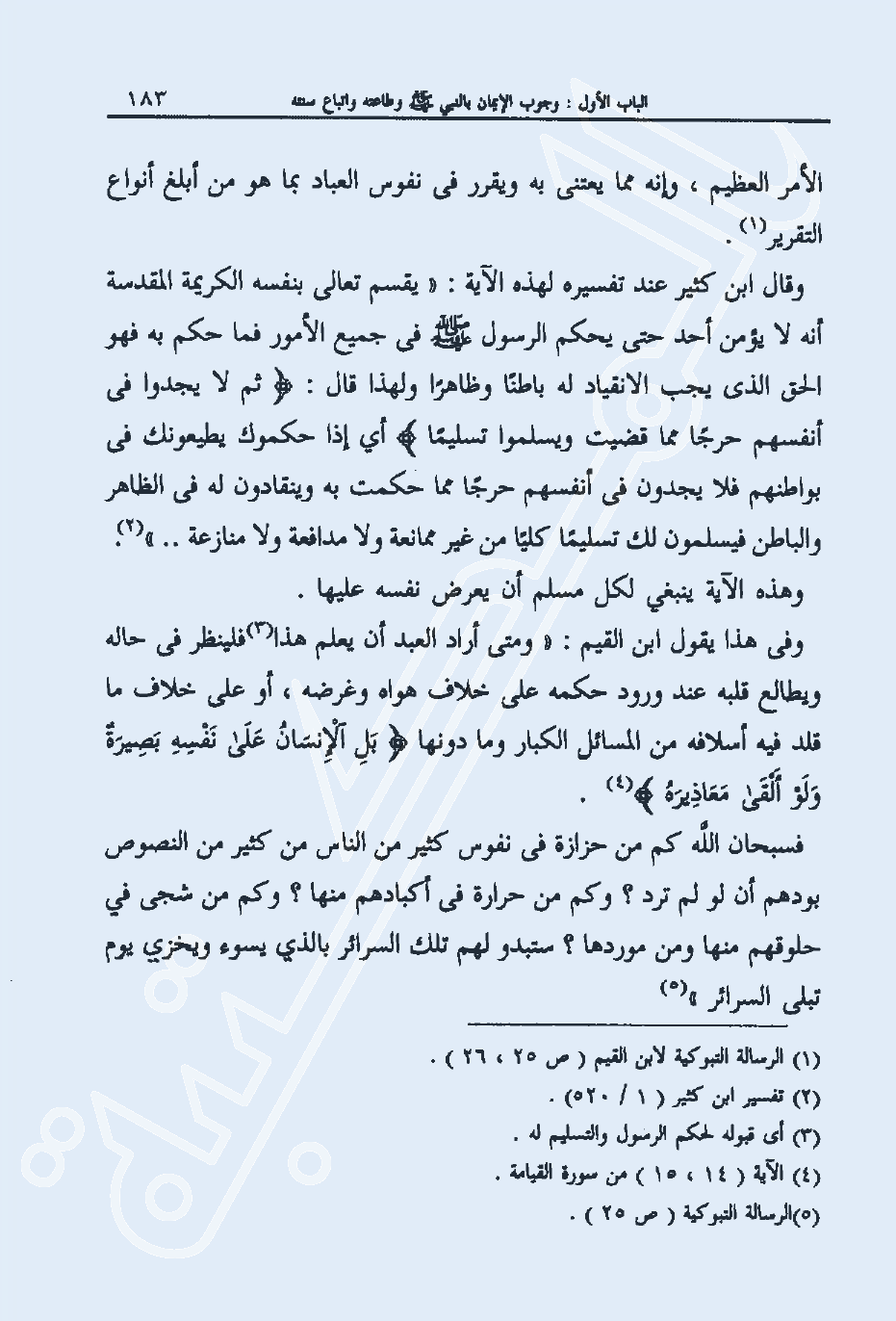 وقال ابن كثير عند تفسيره لهذه الآية: "يقسم تعالى بنفسه الكريمة المقدسة أنه لا يؤمن أحد حتى يحكم الرسول صلى الله عليه وسلم في جميع الأمور فما حكم به فهو الحق الذي يجب الانقياد له باطنا وظاهرا ولهذا قال: {ثُمَّ لا يَجِدُوا فِي أَنْفُسِهِمْ حَرَجاً مِمَّا قَضَيْتَ وَيُسَلِّمُوا تَسْلِيماً} أي إذا حكموك يطيعونك في بواطنهم فلا يجدون في أنفسهم حرجا مما حكمت به وينقادون له في الظاهر والباطن فيسلمون لك تسليما كليا من غير ممانعة ولا مدافعة ولا منازعة ... "2.