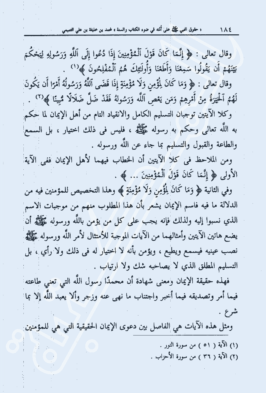 وقال تعالى: {وَمَا كَانَ لِمُؤْمِنٍ وَلا مُؤْمِنَةٍ إِذَا قَضَى اللَّهُ وَرَسُولُهُ أَمْراً أَنْ يَكُونَ لَهُمُ الْخِيَرَةُ مِنْ أَمْرِهِمْ وَمَنْ يَعْصِ اللَّهَ وَرَسُولَهُ فَقَدْ ضَلَّ ضَلالاً مُبِيناً} 2، وكلا الآيتين توجبان التسليم الكامل والانقياد التام من أهل الإيمان لما حكم به الله تعالى وحكم به رسوله صلى الله عليه وسلم، فليس في ذلك اختيار، بل السمع والطاعة والقبول والتسليم بما جاء عن الله ورسوله.