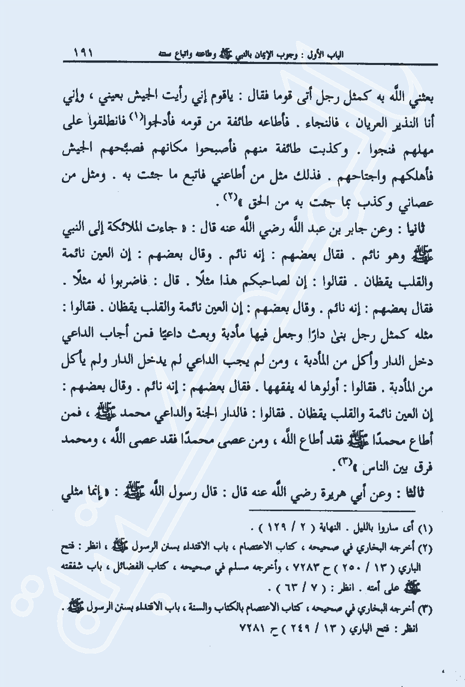 ثانيا: وعن جابر بن عبد الله رضي الله عنه قال: "جاءت الملائكة إلى النبي صلى الله عليه وسلم وهو نائم، فقال بعضهم: إنه نائم. وقال بعضهم: إن العين نائمة والقلب يقظان، فقالوا: إن لصاحبكم هذا مثلا، قال: فاضربوا له مثلان فقال بعضهم: إنه نائم، وقال بعضهم: إن العين نائمة والقلب يقظان، فقالوا: مثله كمثل رجل بنى دارا وجعل فيها مأدبة وبعث داعيا فمن أجاب الداعي دخل الدار وأكل من المأدبة، ومن لم يجب الداعي لم يدخل الدار ولم يأكل من المأدبة، فقالوا: أولوها له يفقهها، فقال بعضهم: إنه نائم، وقال بعضهم: إن العين نائمة والقلب يقظان، فقالوا: فالدار الجنة والداعي محمد صلى الله عليه وسلم، فمن أطاع محمدا صلى الله عليه وسلم فقد أطاع الله، ومن عصى محمدا فقد عصى الله، ومحمد فرق بين الناس"3.