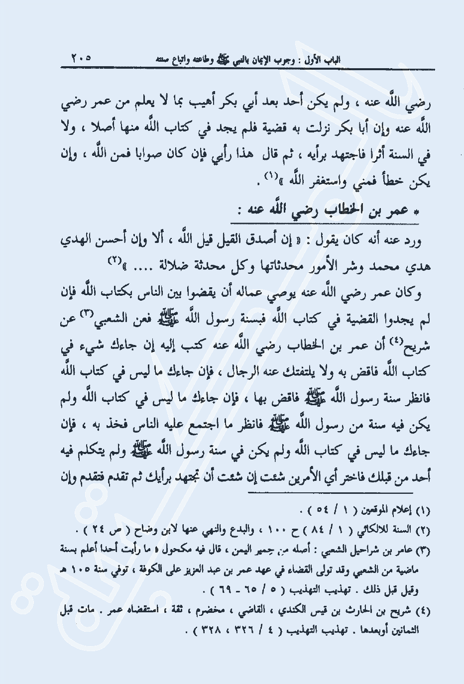 وكان عمر رضي الله عنه يوصي عماله أن يقضوا بين الناس بكتاب الله فإن لم يجدوا القضية في كتاب الله فبسنة رسول الله صلى الله عليه وسلم فعن الشعبي3 عن شريح4 أن عمر بن الخطاب رضي الله عنه كتب إليه إن جاءك شيء في كتاب الله فاقض به ولا يلتفتك عنه الرجال، فإن جاءك ما ليس في كتاب الله فانظر سنة رسول الله صلى الله عليه وسلم فاقض بها، فإن جاءك ما ليس في كتاب الله ولم يكن فيه سنة من رسول الله صلى الله عليه وسلم فانظر ما اجتمع عليه الناس فخذ به، فإن جاءك ما ليس في كتاب الله ولم يكن في سنة رسول الله صلى الله عليه وسلم ولم يتكلم فيه أحد من قبلك فاختر أي الأمرين شئت: إن شئت أن تجتهد برأيك ثم تقدم فتقدم، وإن