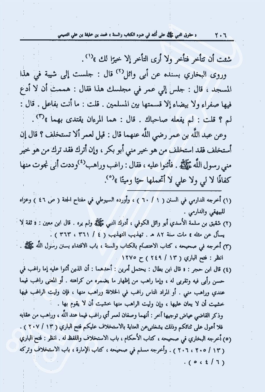 5 أخرجه البخاري في صحيحه، كتاب الأحكام: باب الاستخلاف واللفظ له. انظر: فتح الباري (13/ 255، 256) . وأخرجه مسلم في صحيحه، كتاب الإمارة: باب الاستخلاف وتركه (6/4، 5) .