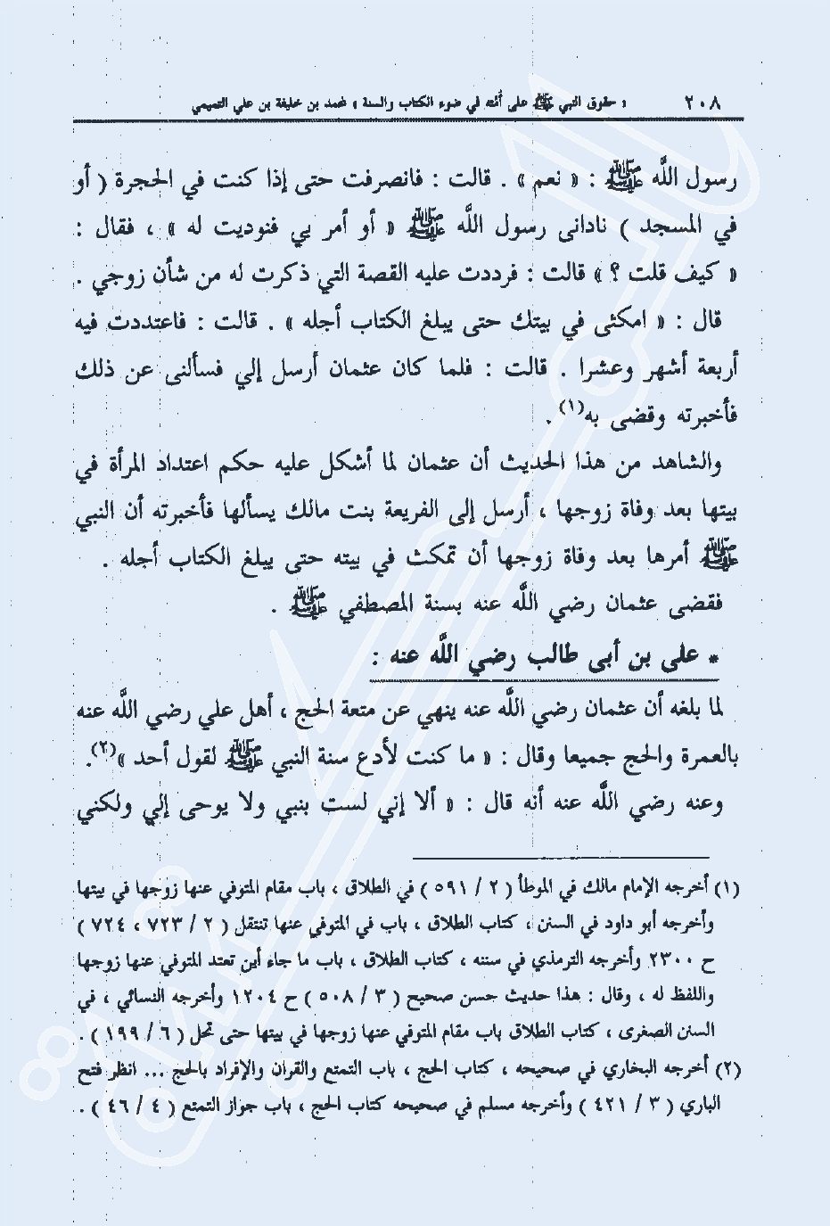 والشاهد من هذا الحديث أن عثمان لما أشكل عليه حكم اعتداد المرأة في بيتها بعد وفاة زوجها، أرسل إلى الفريعة بنت مالك يسألها فأخبرته أن النبي صلى الله عليه وسلم أمرها بعد وفاة زوجها أن تمكث في بيته حتى يبلغ الكتاب أجله. فقضى عثمان رضي الله عنه بسنة المصطفى صلى الله عليه وسلم.