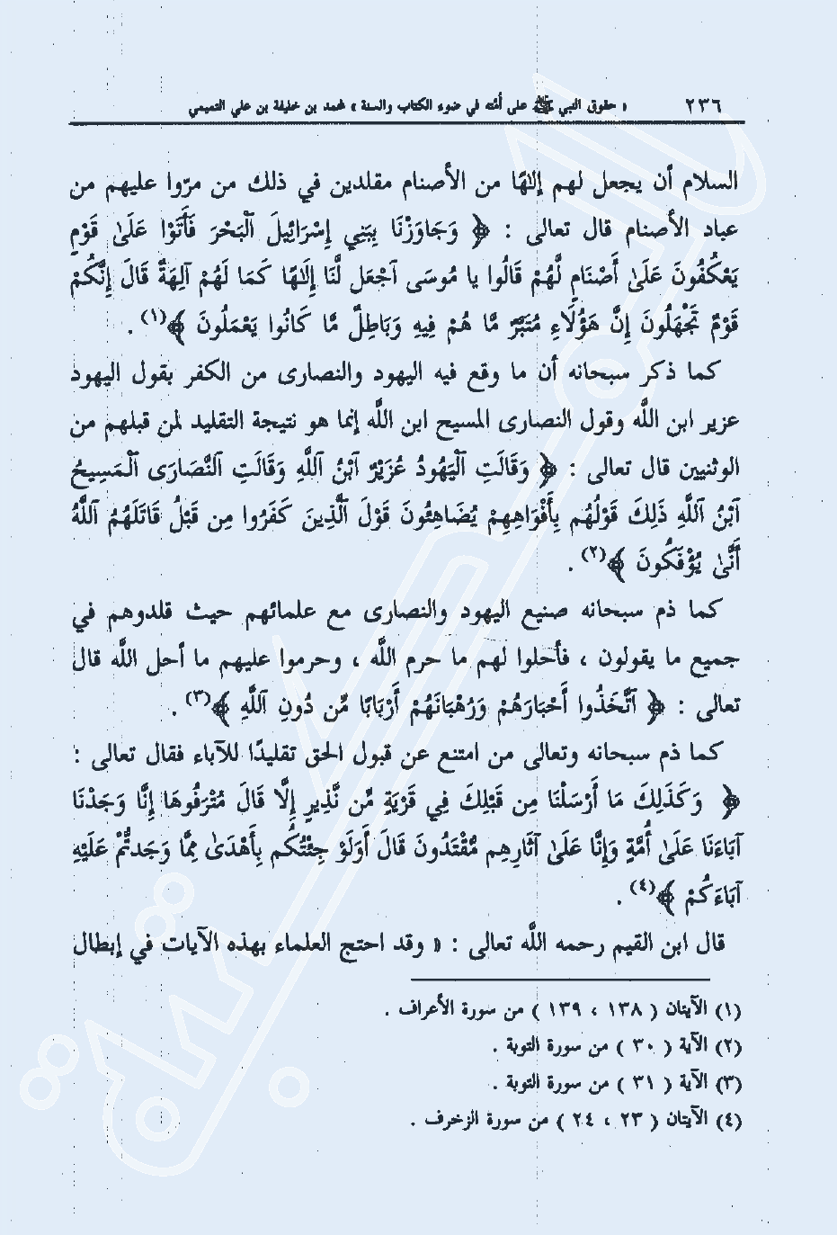 السلام أن يجعل لهم إلها من الأصنام مقلدين في ذلك من مرّوا عليهم من عباد الأصنام قال تعالى: {وَجَاوَزْنَا بِبَنِي إِسْرائيلَ الْبَحْرَ فَأَتَوْا عَلَى قَوْمٍ يَعْكُفُونَ عَلَى أَصْنَامٍ لَهُمْ قَالُوا يَا مُوسَى اجْعَلْ لَنَا إِلَهاً كَمَا لَهُمْ آلِهَةٌ قَالَ إِنَّكُمْ قَوْمٌ تَجْهَلُونَ، إِنَّ هَؤُلاءِ مُتَبَّرٌ مَا هُمْ فِيهِ وَبَاطِلٌ مَا كَانُوا يَعْمَلُونَ} 1، كما ذكر سبحانه أن ما وقع فيه اليهود والنصارى من الكفر بقول اليهود عزير ابن الله وقول النصارى المسيح ابن الله إنما هو نتيجة التقليد لمن قبلهم من الوثنيين قال تعالى: {وَقَالَتِ الْيَهُودُ عُزَيْرٌ ابْنُ اللَّهِ وَقَالَتِ النَّصَارَى الْمَسِيحُ ابْنُ اللَّهِ ذَلِكَ قَوْلُهُمْ بِأَفْوَاهِهِمْ يُضَاهِئُونَ قَوْلَ الَّذِينَ كَفَرُوا مِنْ قَبْلُ قَاتَلَهُمُ اللَّهُ أَنَّى يُؤْفَكُونَ} 2.