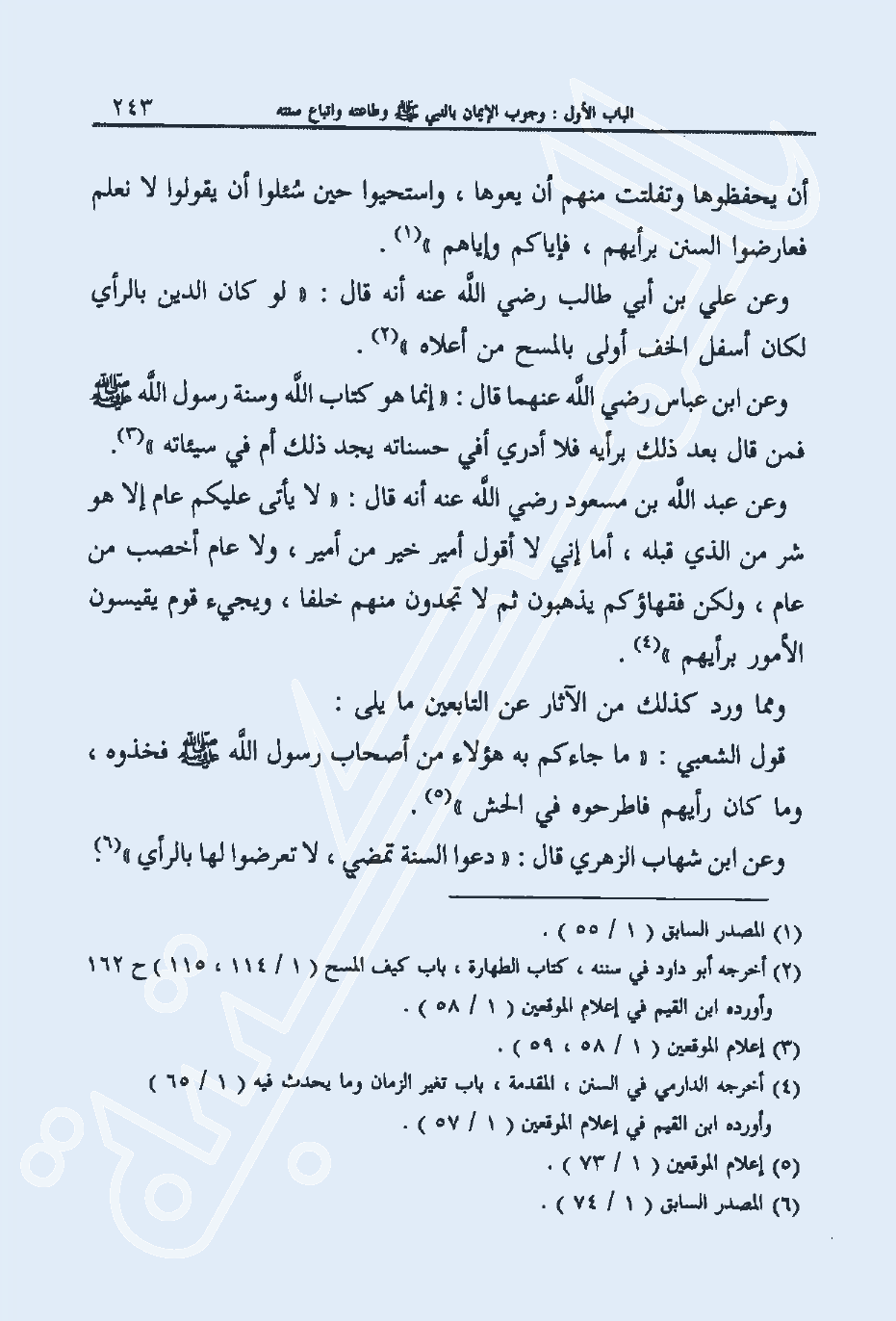 وعن علي بن أبي طالب رضي الله عنه أنه قال: "لو كان الدين بالرأي لكان أسفل الخف أولى بالمسح من أعلاه"2.