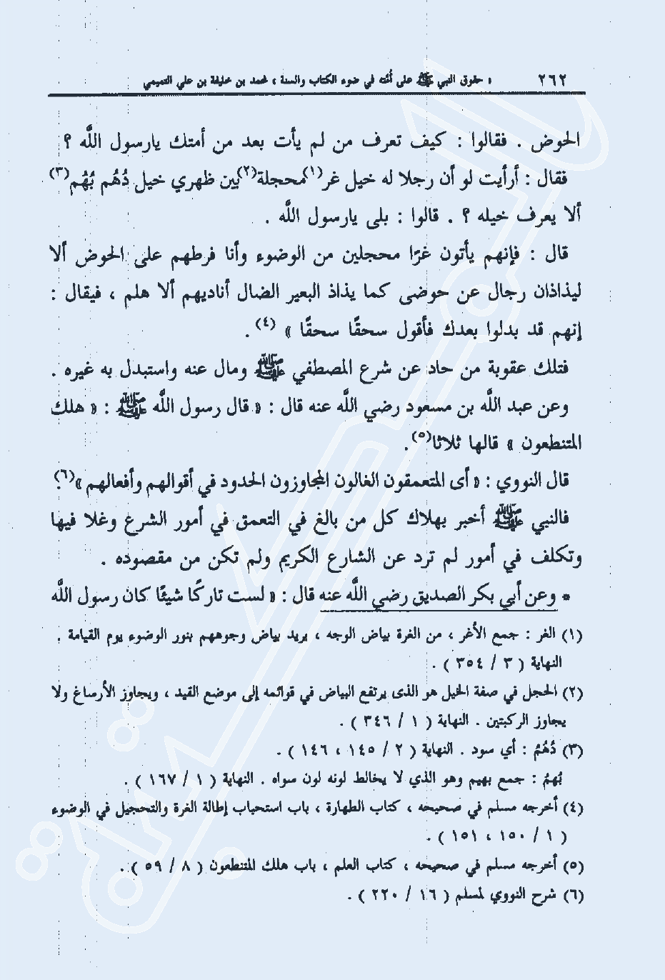 الحوض. فقالوا: كيف تعرف من لم يأت بعد من أمتك يارسول الله؟، فقال: أرأيت لو أن رجلا له خيل غر1 محجلة2 بين ظهري خيل دُهُم بُهُم3 ألا يعرف خيله؟. قالوا: بلى يارسول الله، قال: فإنهم يأتون غرا محجلين من الوضوء وأنا فرطهم على الحوض ألا ليذادن رجال عن حوضى كما يذاد البعير الضال أناديهم ألا هلم، فيقال: إنهم قد بدلوا بعدك فأقول سحقا سحقا" 4.