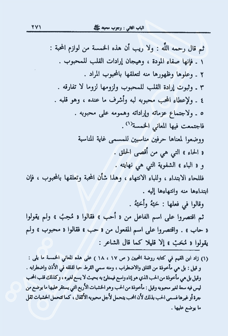 ثم قال رحمه الله: ولا ريب أن هذه الخمسة من لوازم المحبة: