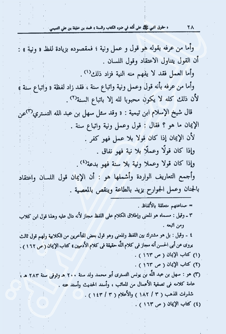 قال شيخ الإسلام ابن تيمية: "وقد سئل سهل بن عبد الله التستري3 عن الإيمان ما هو؟، فقال: قول وعمل ونية واتباع سنة.