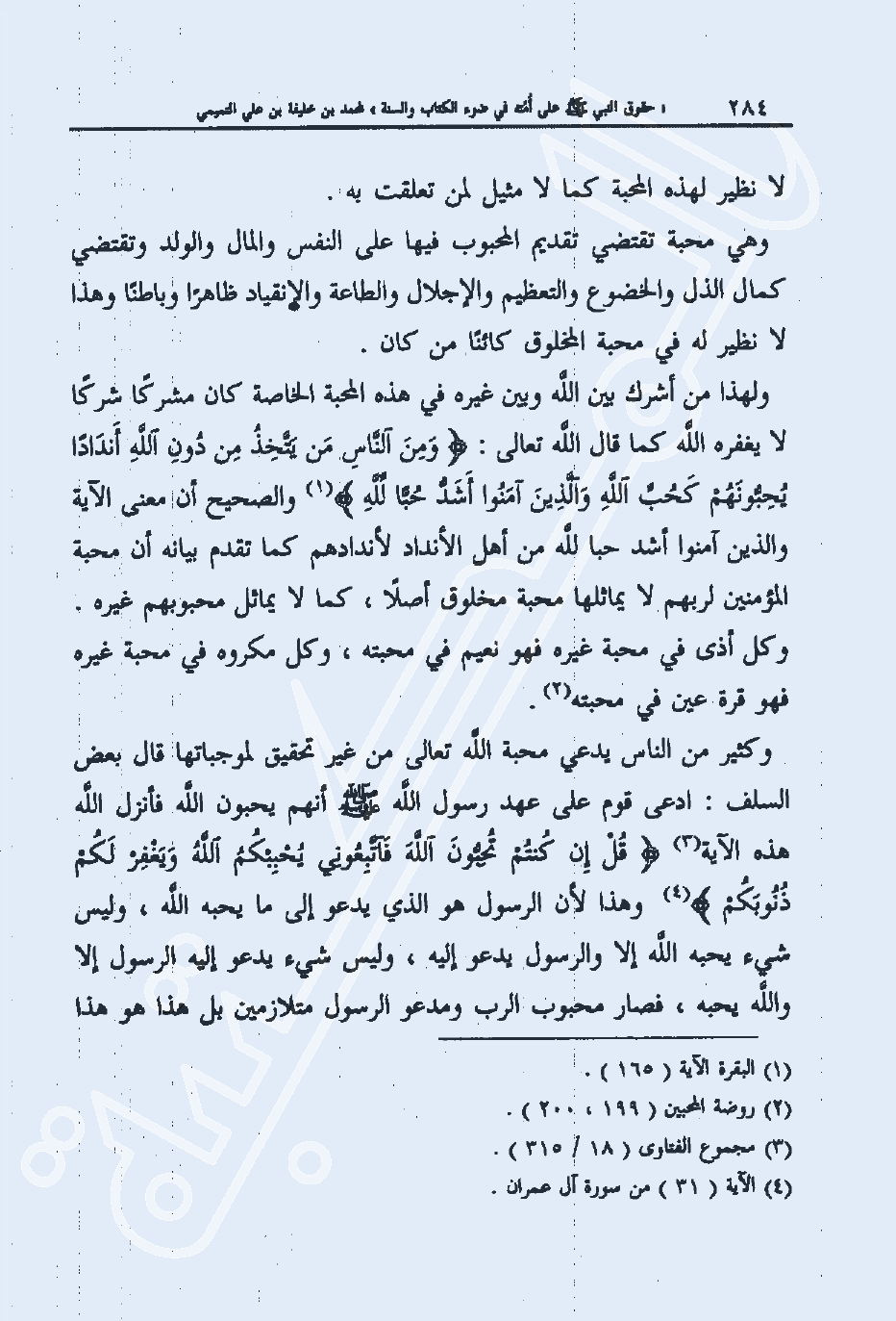 وهي محبة تقتضي تقديم المحبوب فيها على النفس والمال والولد وتقتضي كمال الذل والخضوع والتعظيم والإجلال والطاعة والانقياد ظاهرا وباطنا وهذا لا نظير له في محبة المخلوق كائنا من كان.