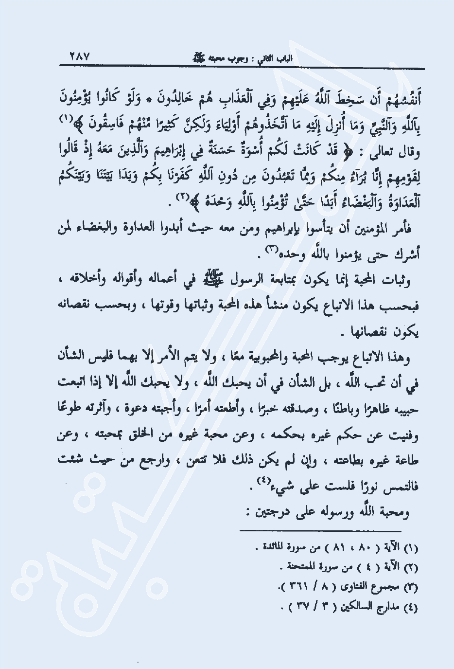 وثبات المحبة إنما يكون بمتابعة الرسول صلى الله عليه وسلم في أعماله وأقواله وأخلاقه، فبحسب هذا الاتباع يكون منشأ هذه المحبة وثباتها وقوتها، وبحسب نقصانه يكون نقصانها.
