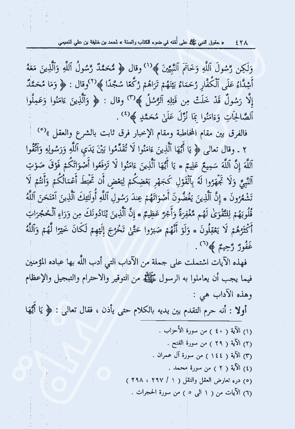 2- وقال تعالى: {يَا أَيُّهَا الَّذِينَ آمَنُوا لا تُقَدِّمُوا بَيْنَ يَدَيِ اللَّهِ وَرَسُولِهِ وَاتَّقُوا اللَّهَ إِنَّ اللَّهَ سَمِيعٌ عَلِيمٌ يَا أَيُّهَا الَّذِينَ آمَنُوا لا تَرْفَعُوا أَصْوَاتَكُمْ فَوْقَ صَوْتِ النَّبِيِّ وَلا تَجْهَرُوا لَهُ بِالْقَوْلِ كَجَهْرِ بَعْضِكُمْ لِبَعْضٍ أَنْ تَحْبَطَ أَعْمَالُكُمْ وَأَنْتُمْ لا تَشْعُرُونَ إِنَّ الَّذِينَ يَغُضُّونَ أَصْوَاتَهُمْ عِنْدَ رَسُولِ اللَّهِ أُولَئِكَ الَّذِينَ امْتَحَنَ اللَّهُ قُلُوبَهُمْ لِلتَّقْوَى لَهُمْ مَغْفِرَةٌ وَأَجْرٌ عَظِيمٌ إِنَّ الَّذِينَ يُنَادُونَكَ مِنْ وَرَاءِ الْحُجُرَاتِ أَكْثَرُهُمْ لا يَعْقِلُونَ وَلَوْ أَنَّهُمْ صَبَرُوا حَتَّى تَخْرُجَ إِلَيْهِمْ لَكَانَ خَيْراً لَهُمْ وَاللَّهُ غَفُورٌ رَحِيمٌ} 6
