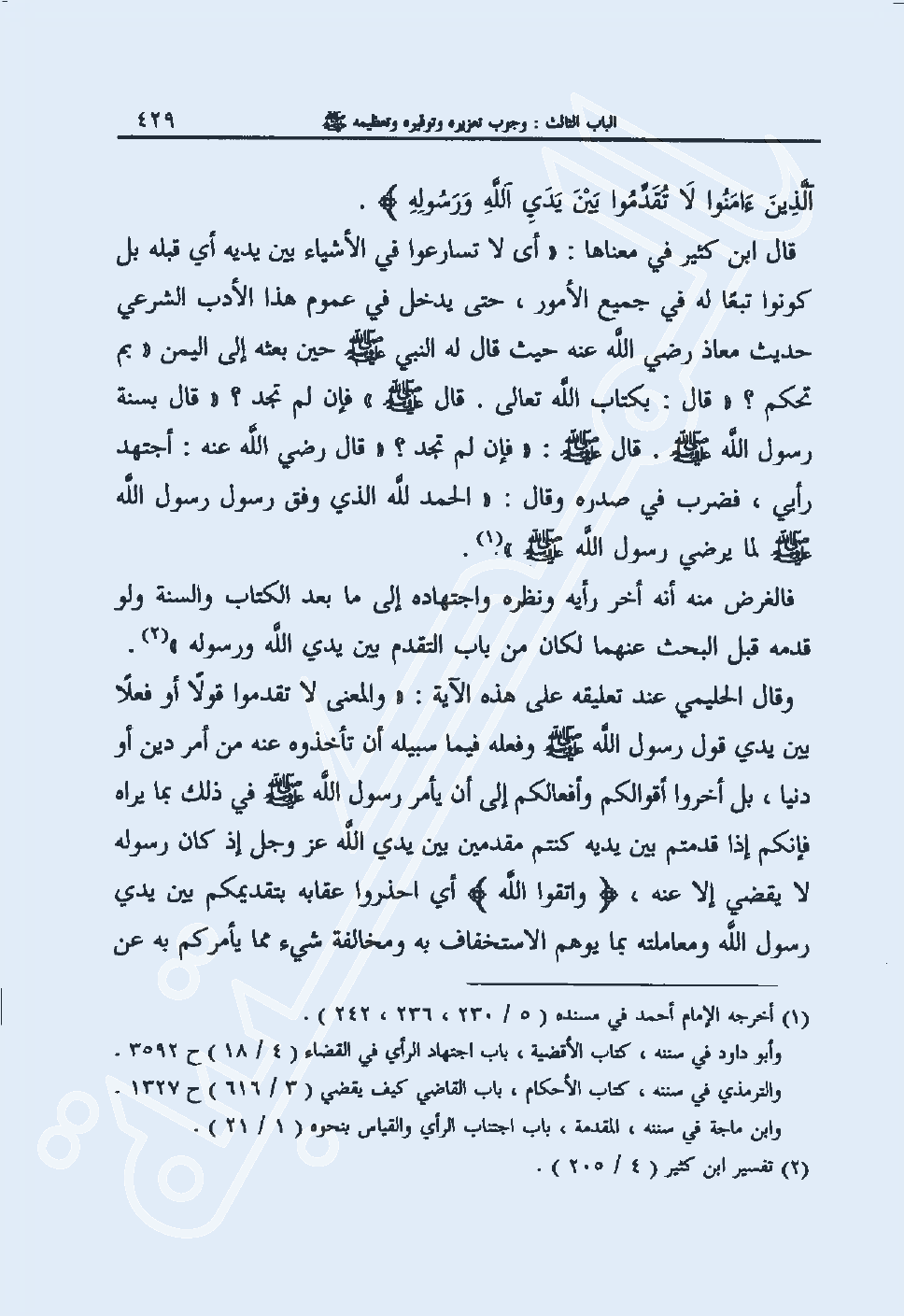 قال ابن كثير في معناها: "أي لا تسارعوا في الأشياء بين يديه أي قبله بل كونوا تبعا له في جميع الأمور، حتى يدخل في عموم هذا الأدب الشرعي حديث معاذ رضي الله عنه حيث قال له النبي صلى الله عليه وسلم حين بعثه إلى اليمن "بم تحكم؟ " قال: بكتاب الله تعالى. قال صلى الله عليه وسلم "فإن لم تجد؟ "قال بسنة رسول الله صلى الله عليه وسلم. قال صلى الله عليه وسلم: "فإن لم تجد؟ "قال رضي الله عنه: أجتهد رأي، فضرب في صدره وقال: "الحمد لله الذي وفق رسول رسول الله صلى الله عليه وسلم لما يرضي رسول الله صلى الله عليه وسلم" 1.