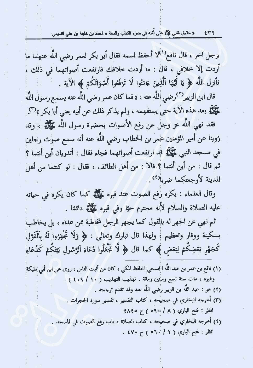 فقد نهي الله عز وجل عن رفع الأصوات بحضرة رسول الله صلى الله عليه وسلم، وقد روينا عن أمير المؤمنين عمر بن الخطاب رضي الله عنه أنه سمع صوت رجلين في مسجد النبي صلى الله عليه وسلم قد ارتفعت أصواتهما فجاء فقال: أتدريان أين أنتما؟ ثم قال: من أين أنتما؟ قالا: من أهل الطائف، فقال: لو كنتما من أهل المدينة لأوجعتكما ضربا4.