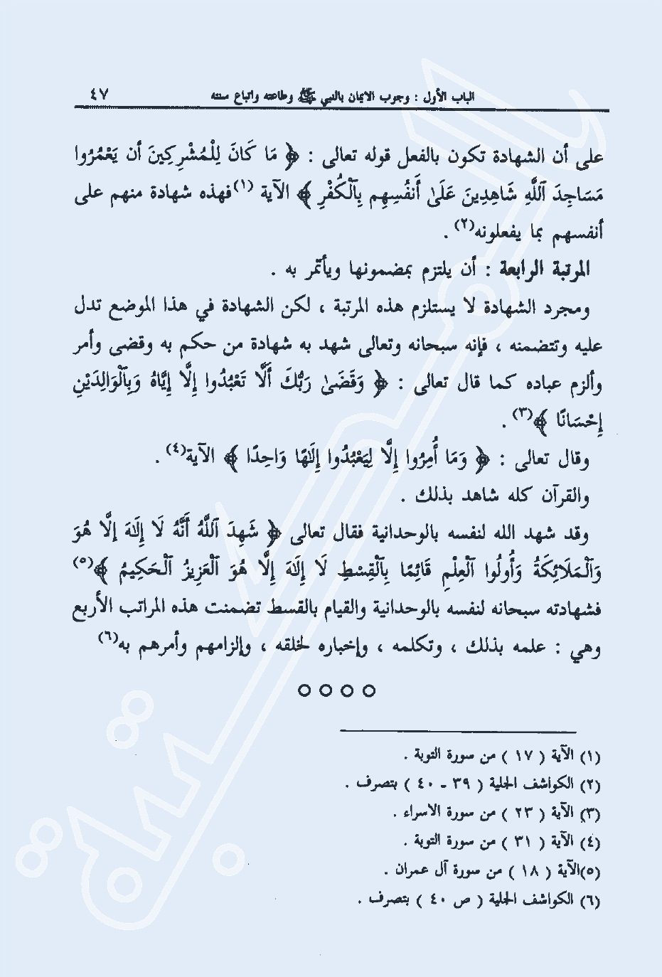 وقد شهد الله لنفسه بالوحدانية فقال تعالى {شَهِدَ اللَّهُ أَنَّهُ لا إِلَهَ إِلاَّ هُوَ وَالْمَلائِكَةُ وَأُولُو الْعِلْمِ قَائِماً بِالْقِسْطِ لا إِلَهَ إِلاَّ هُوَ الْعَزِيزُ الْحَكِيمُ} 5 فشهادته سبحانه لنفسه بالوحدانية والقيام بالقسط تضمنت هذه المراتب الأربع وهي: علمه بذلك، وتكلمه، وإخباره لخلقه، وإلزامهم وأمرهم به6.