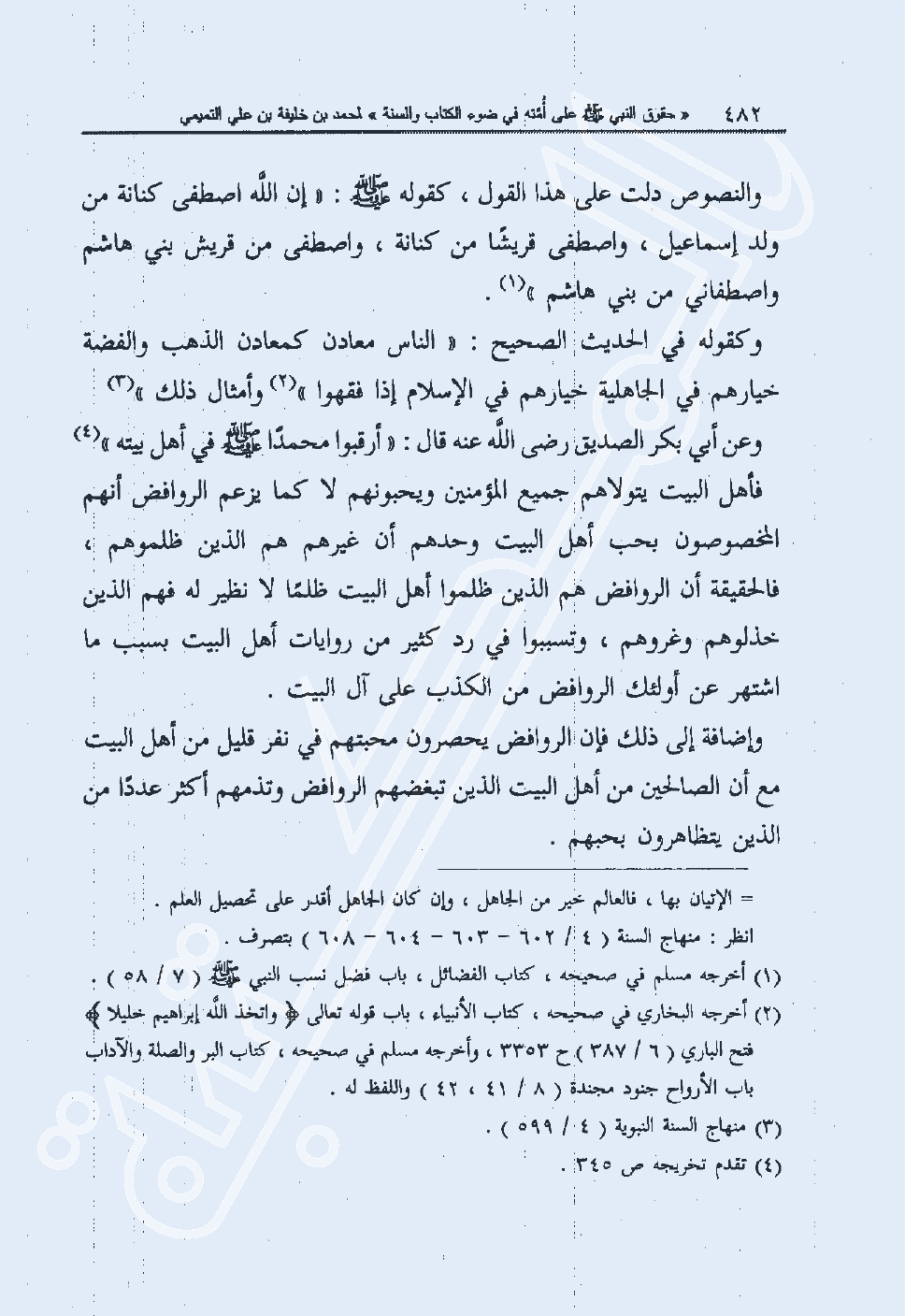 وكقوله في الحديث الصحيح: "الناس معادن كمعادن الذهب والفضة خيارهم في الجاهلية خيارهم في الإسلام إذا فقهوا" 2 وأمثال ذلك"3 وعن أبي بكر الصديق رضي الله عنه قال: "أرقبوا محمدا صلى الله عليه وسلم في أهل بيته"4 فأهل البيت يتولاهم جميع المؤمنين ويحبونهم لا كما يزعم الروافض أنهم المخصوصون بحب أهل البيت وحدهم أن غيرهم هم الذين ظلموهم، فالحقيقة أن الروافض هم الذين ظلموا أهل البيت ظلما لا نظير له فهم الذين خذلوهم وغروهم، وتسببوا في رد كثير من روايات أهل البيت بسبب ما اشتهر عن أولئك الروافض من الكذب على آل البيت.