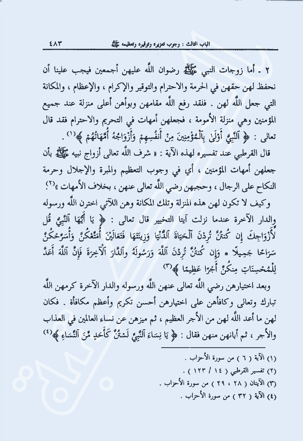 قال القرطبي عند تفسيره لهذه الآية: "شرف الله تعالى أزواج نبيه صلى الله عليه وسلم بأن جعلهن أمهات المؤمنين، أي في وجوب التعظيم والمبرة والإجلال وحرمة النكاح على الرجال، وحجبهن رضي الله تعالى عنهن، بخلاف الأمهات"2