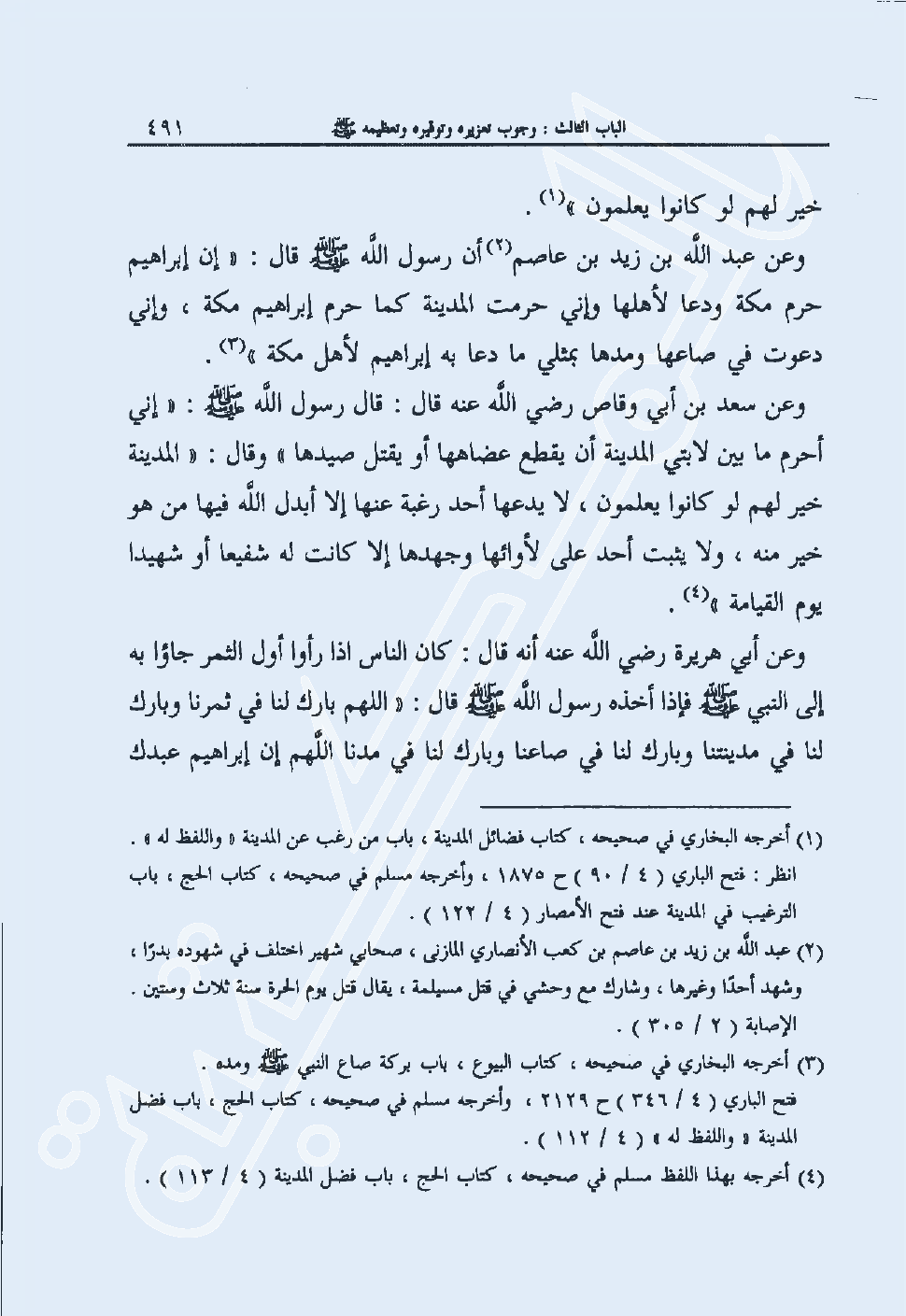 وعن عبد الله بن زيد بن عاصم2 أن رسول الله صلى الله عليه وسلم قال: "إن إبراهيم حرم مكة ودعا لأهلها وإني حرمت المدينة كما حرم إبراهيم مكة، وإني دعوت في صاعها ومدها تمثلي ما دعا به إبراهيم لأهل مكة" 3.