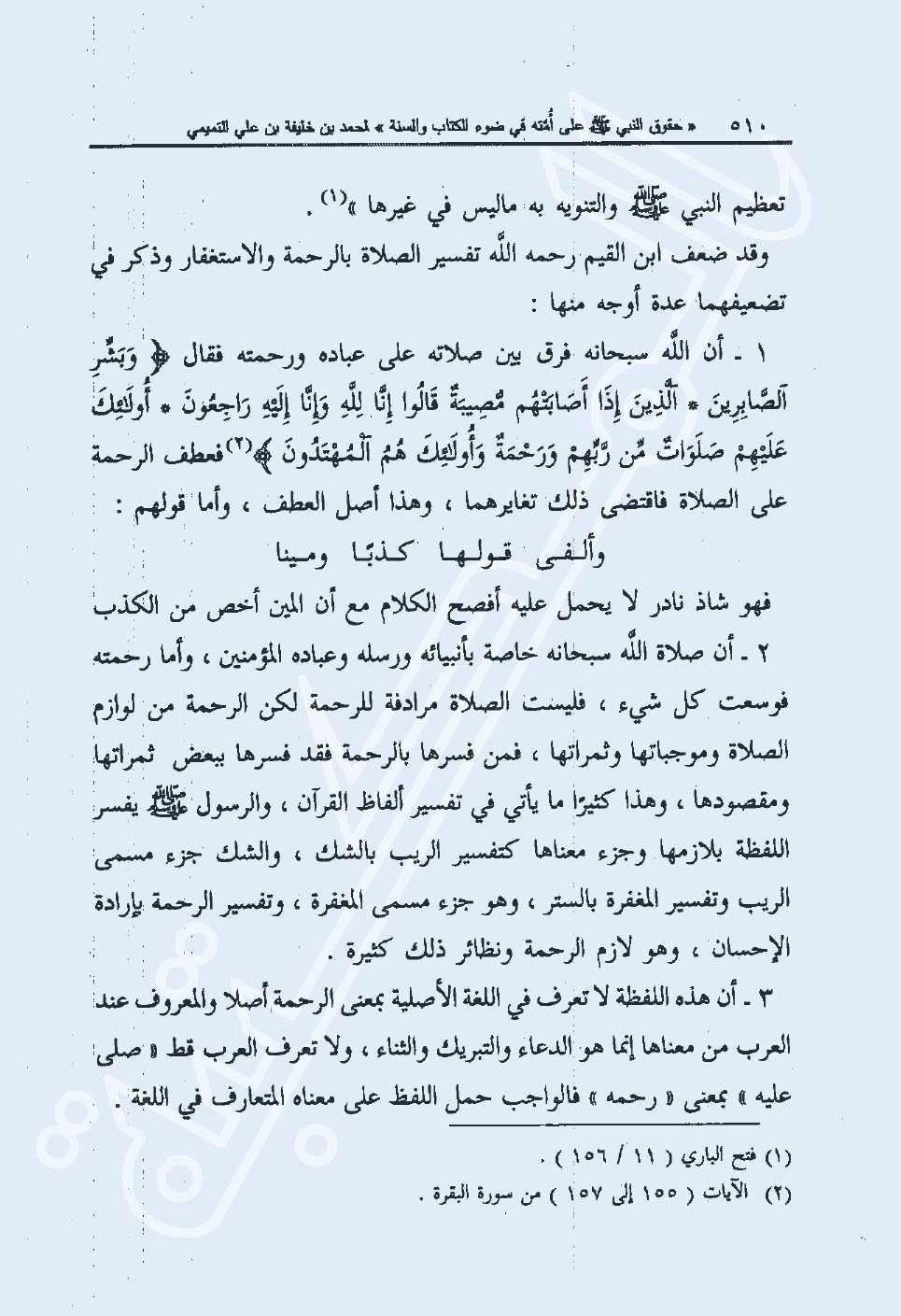 1- أن الله سبحانه فرق بين صلاته على عباده ورحمته فقال: {وَبَشِّرِ الصَّابِرِينَ الَّذِينَ إِذَا أَصَابَتْهُمْ مُصِيبَةٌ قَالُوا إِنَّا لِلَّهِ وَإِنَّا إِلَيْهِ رَاجِعُونَ أُولَئِكَ عَلَيْهِمْ صَلَوَاتٌ مِنْ رَبِّهِمْ وَرَحْمَةٌ وَأُولَئِكَ هُمُ الْمُهْتَدُونَ} 2 فعطف الرحمة على الصلاة فاقتضى ذلك تغايرهما، وهذا أصل العطف، وأما قولهم:
