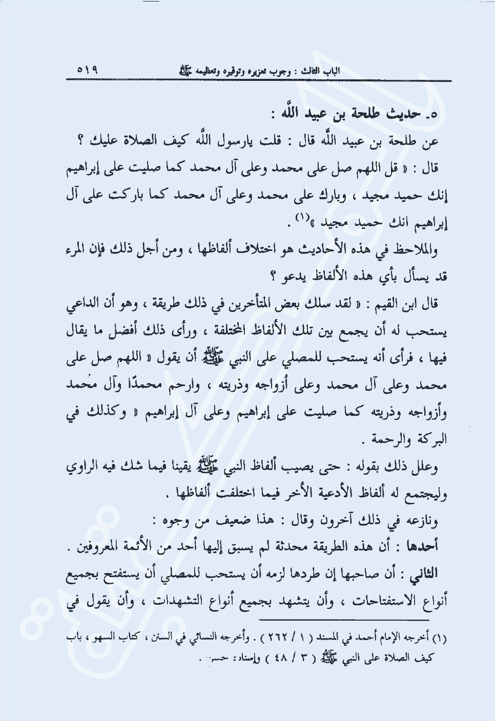 عن طلحة بن عبيد الله قال: قلت يارسول الله كيف الصلاة عليك؟ قال: "قل اللهم صل على محمد وعلى آل محمد كما صليت على إبراهيم إنك حميد مجيد، وبارك على محمد وعلى آل محمد كما باركت على آل إبراهيم انك حميد مجيد"1.