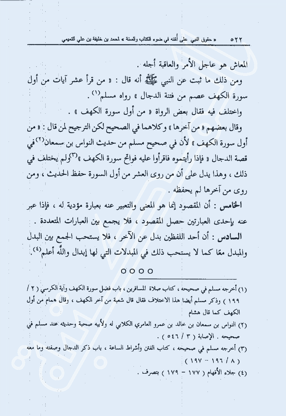 1 أخرجه مسلم في صحيحه، كتاب صلاة المسافرين، باب فضل سورة الكهف وآية الكرسي (2/ 199) وذكر مسلم أيضا هذا الاختلاف فقال قال شعبة من آخر الكهف، وقال "همام من أول الكهف كما قال هشام