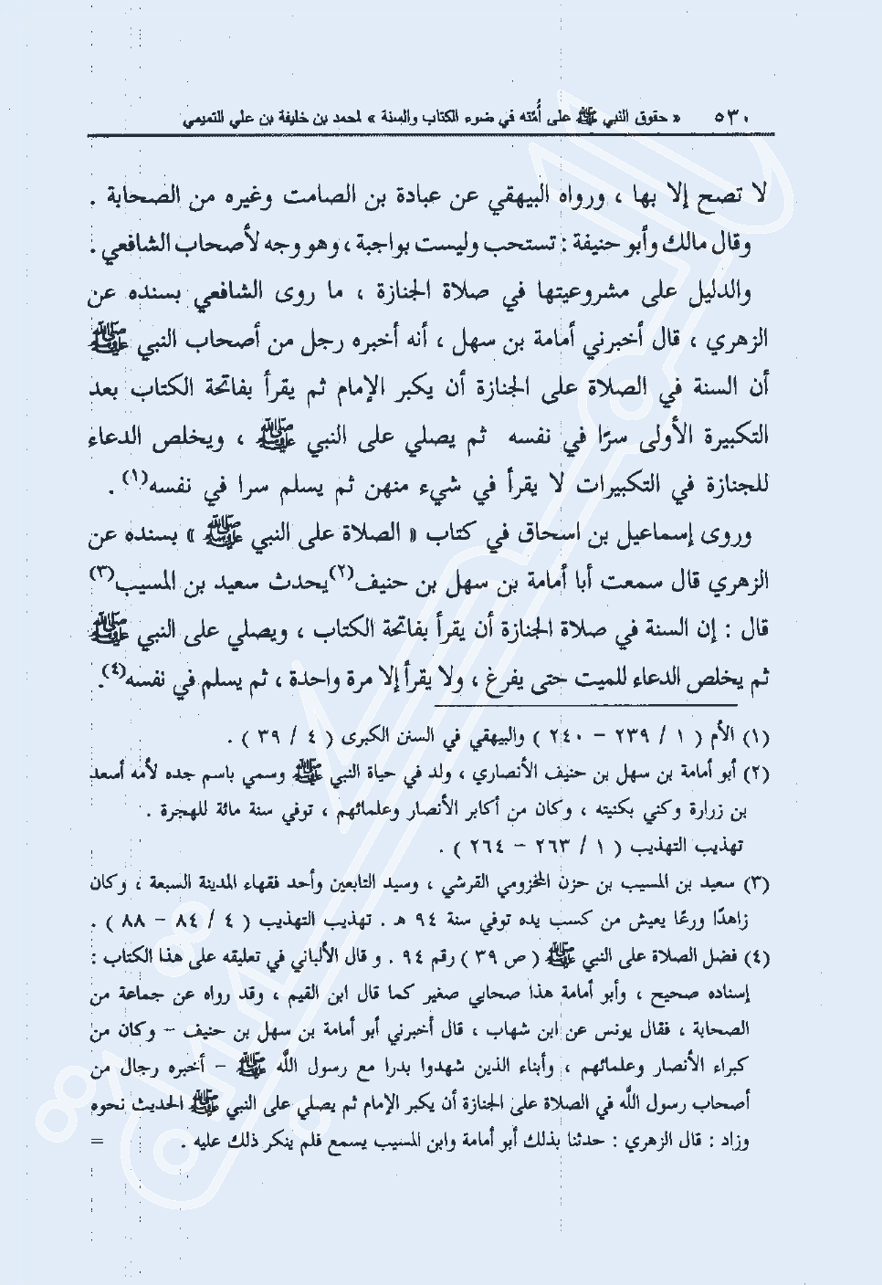 4 فضل الصلاة على النبي صلى الله عليه وسلم (ص 39) رقم 94. وقال الألباني في تعليقه على هذا الكتاب: اسناده صحيح، وأبو أمامة هذا صحابي صغير كما قال ابن القيم، وقد رواه عن جماعة من الصحابة، فقال يونس عن ابن شهاب، قال أخبرني أبو أمامة بن سهل بن حنيف- وكان من كبراء الأنصار وعلمائهم، وأبناء الذين شهدوا بدرا مع رسول الله صلى الله عليه وسلم - أخبره رجال من أصحاب رسول الله في الصلاة على الجنازة أن يكبر الامام ثم يصلي على النبي صلى الله عليه وسلم الحديث نحوه وزاد: قال الزهري: حدثنا بذلك أبو أمامة وابن المسيب يسمع فلم ينكر ذلك عليه. قال ابن شهاب: فذكرت الذي أخبرني أبو أمامة من السنة في الصلاة على الميت لمحمد بن سويد فقال وأنا سمعت الضحاك بن قيمة يحدث عن حبيب بن مسلمة في صلاة صلاها على الميت مثل الذي حدثنا أبو امامة.