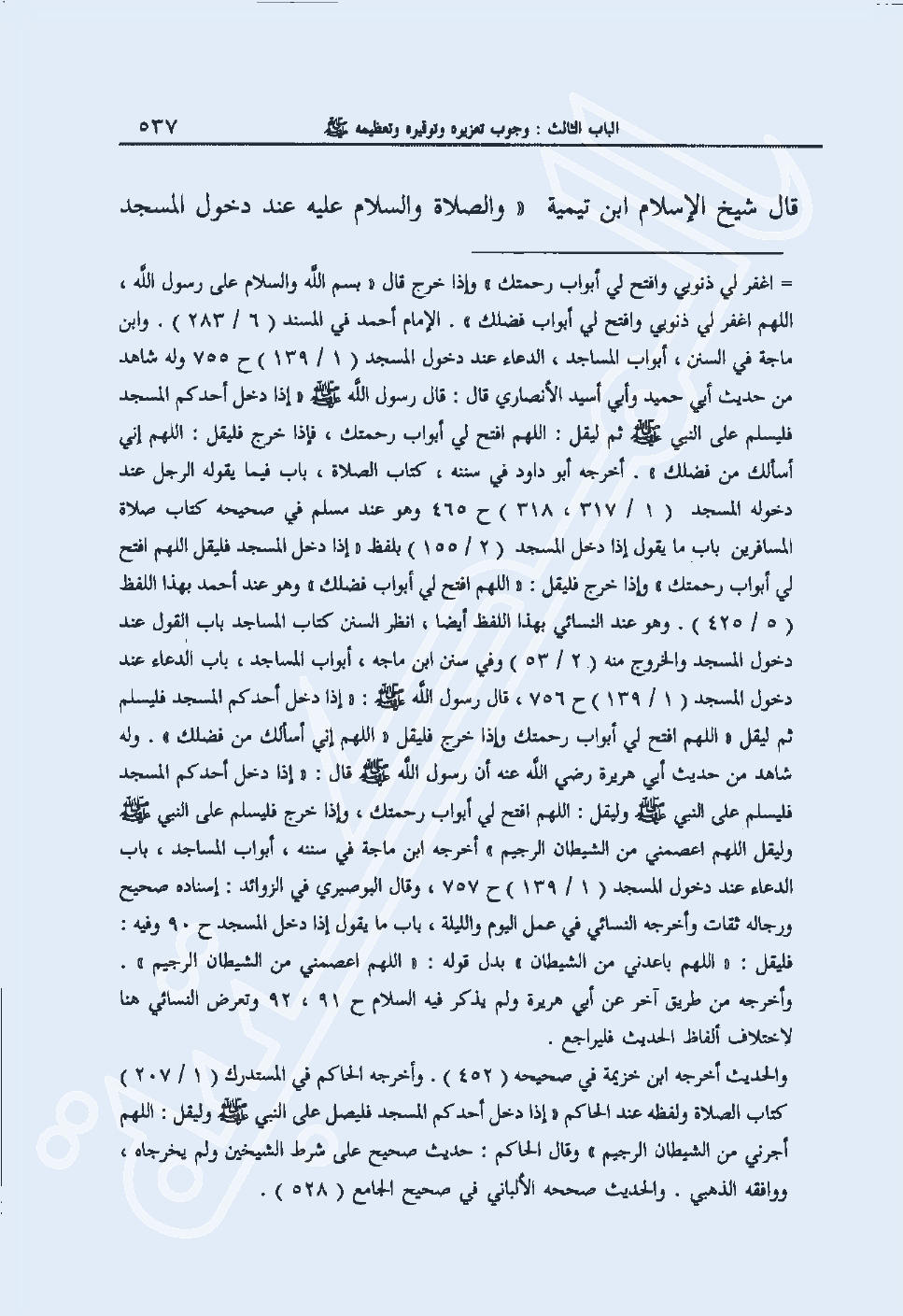 قال شيخ الإسلام ابن تيمية "والصلاة والسلام عليه عند دخول المسجد