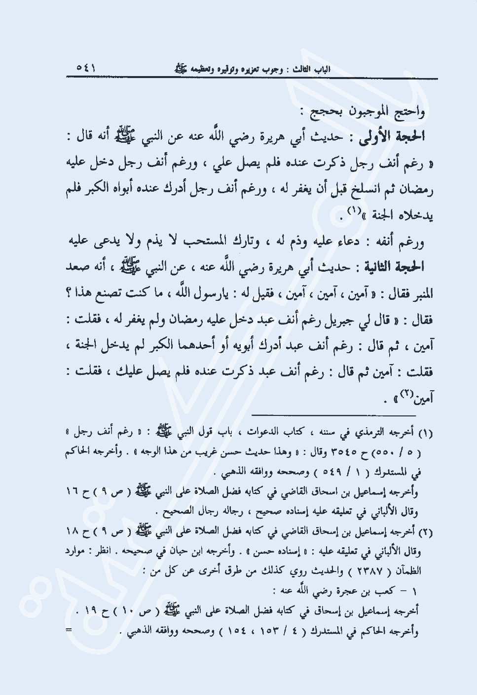 الحجة الأولى: حديث أبي هريرة رضي الله عنه عن النبي صلى الله عليه وسلم أنه قال: "رغم أنف رجل ذكرت عنده فلم يصل علي، ورغم أنف رجل دخل عليه رمضان ثم انسلخ قبل أن يغفر له، ورغم أنف رجل أدرك عنده أبواه الكبر فلم يدخلاه الجنة" 1.