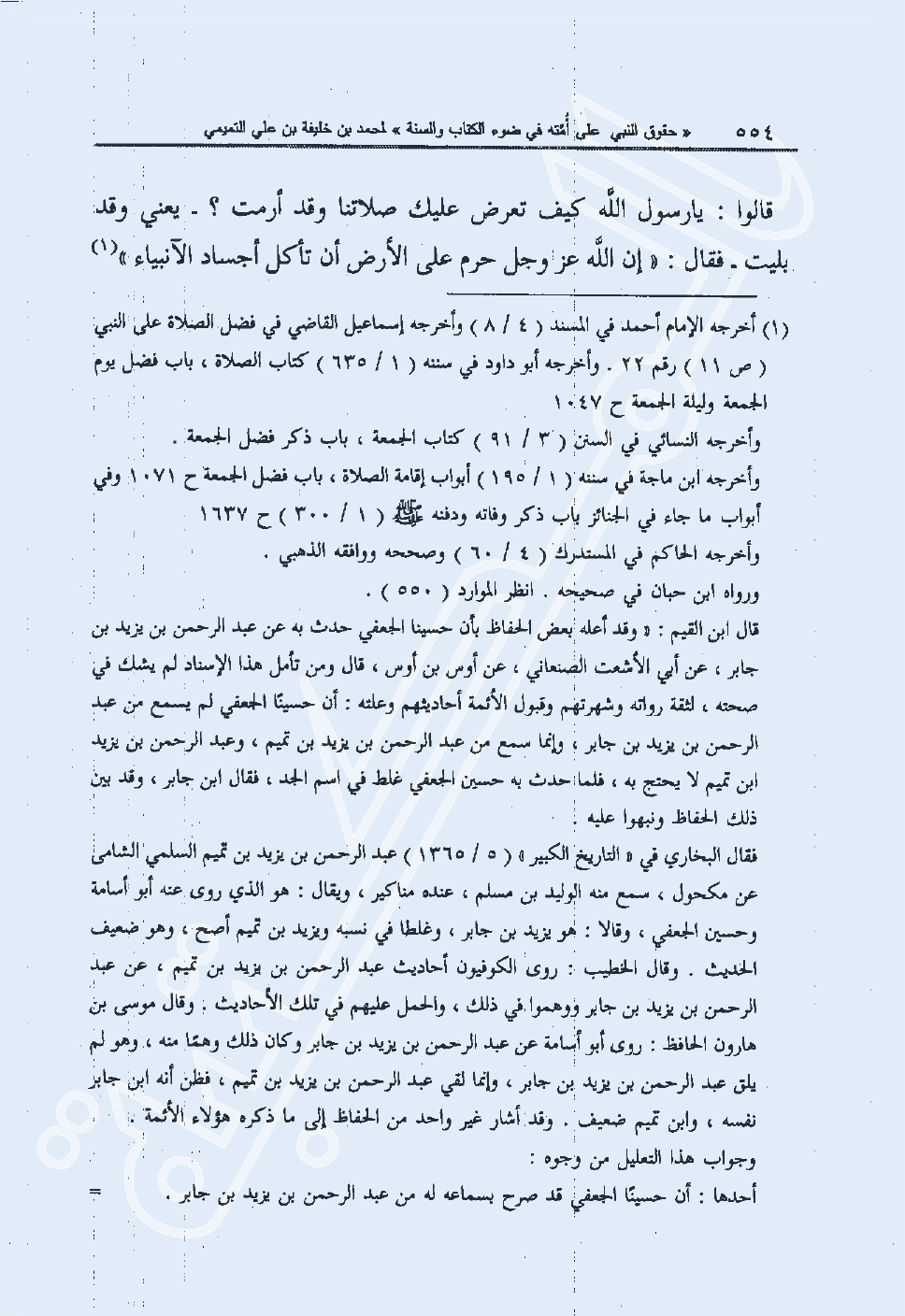 1 أخرجه الإمام أحمد في المسند (4/ 8) وأخرجه اسماعيل القاضي في فضل الصلاة على النبي (ص 11) رقم 22. وأخرجه أبو داود في سننه (1/ 635) كتاب الصلاة، باب فضل يوم الجمعة وليلة الجمعة ح 1047. وأخرجه النسائي في السنن (3/ 91) كتاب الجمعة، باب ذكر فضل الجمعة. وأخرجه ابن ماجة في سننه (1/ 195) أبواب إقامة الصلاة، باب فضل الجمعة ح 1071 وفي أبواب ما جاء في الجنائز باب ذكر وفاته ودفنه صلى الله عليه وسلم (1/ 300) ح 1637. وأخرجه الحاكم في المستدرك (4/ 60) وصححه ووافقه الذهبي. ورواه ابن حبان في صحيحه. انظر الورارد (550) . قال ابن القيم: "وقد أعله بعض الحفاظ بأن حسينا الجعفي حدث به عن عبد الرحمن بن يزيد بن جابر، عن أبي الأشعت الصنعاني، عن أوس بن أوس، قال ومن تأمل هذا الإسناد لم يشك في صحته، لثقة رواته وشهرتهم وقبول الأئمة أحاديثهم وعلته: أن حسينا الجعفي لم يسمع من عبد الرحمن بن يزيد بن جابر، وإنما سمع من عبد الرحمن بن يزيد بن تميم، وعبد الرحمن بن يزيد ابن تميم لا يحتج به، فلما حدث به حبن الجعفي غلط في اسم الجد، فقال ابن جابر، وقد بين ذلك الحفاظ ونبهوا عليه.