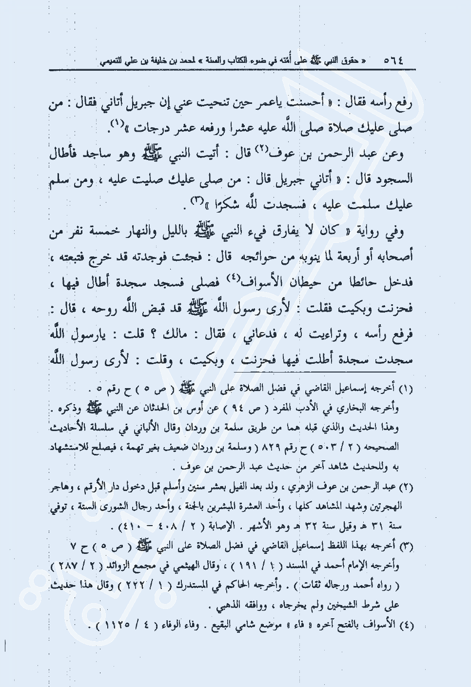 وعن عبد الرحمن بن عوف2 قال: أتيت النبي صلى الله عليه وسلم وهو ساجد فأطال السجود قال: "أتاني جبريل قال: من صلى عليك صليت عليه، ومن سلم عليك سلمت عليه، فسجدت لله شكرا" 3.