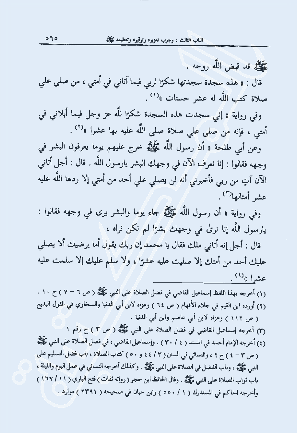 وفي رواية "أن رسول الله صلى الله عليه وسلم جاء يوما والبشر يرى في وجهه فقالوا: يارسول الله إنا نرى في وجهك بشرا لم نكن نراه، قال: أجل إنه أتاني ملك فقال يا محمد إن ربك يقول أما يرضيك ألا يصلي عليك أحد من أمتك إلا صليت عليه عشرا، ولا سلم عليك إلا سلمت عليه عشرا" 4.
