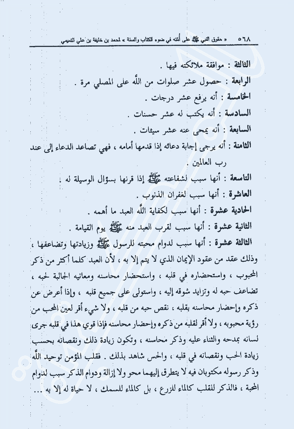 الثالثة عشرة: أنها سبب لدوام محبته للرسول صلى الله عليه وسلم وزيادتها وتضاعفها، وذلك عقد من عقود الإيمان الذي لا يتم إلا به، لأن العبد كلما أكثر من ذكر المحبوب، واستحضاره في قلبه، واستحضار محاسنه ومعانيه الجالبة لحبه، تضاعف حبه له وتزايد شوقه إليه، واستولى على جميع قلبه، وإذا أعرض عن ذكره وإحضار محاسنه بقلبه، نقص حبه من قلبه، ولا شيء أقر لعين المحب من رؤية محبوبه، ولا أقر لقلبه من ذكره وإحضار محاسنه فإذا قوي هذا في قلبه جرى لسانه بمدحه والثناء عليه وذكر محاسنه، وتكون زيادة ذلك ونقصانه بحسب زيادة الحب ونقصانه في قلبه، والحس شاهد بذلك. فقلب المؤمن توحيد الله وذكر رسوله مكتوبان فيه لا يتطرق إليهما محو ولا إزالة ودوام الذكر سبب لدوام المحبة، فالذكر للقلب كالماء للزرع، بل كالماء للسمك، لا حياة له إلا به ...