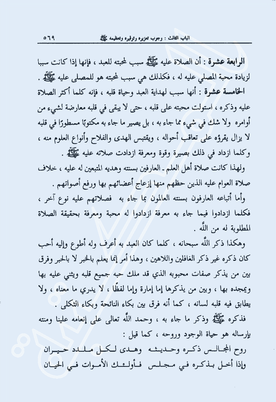 الخامسة عشرة: أنها سبب لهداية العبد وحياة قلبه، فإنه كلما أكثر الصلاة عليه وذكره، استولت محبته على قلبه، حتى لألقى في قلبه معارضة لشيء من أوامره ولاشك في شيء مم اجاء به، بل يصير ما جاء به مكتوبا مسطورا في قلبه لا يزال يقرؤه على تعاقب أحواله، ويقتبس الهدى والفلاح وأنواع العلوم منه، وكلما ازداد في ذلك بصيرة وقوة ومعرفة ازدادت صلاته عليه صلى الله عليه وسلم.