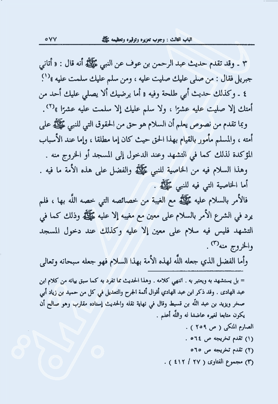 3- وقد تقدم حديث عبد الرحمن بن عوف عن النبي صلى الله عليه وسلم أنه قال: "أتاني جبريل فقال: من صلى عليك صليت عليه، ومن سلم عليك سلمت عليه" 1