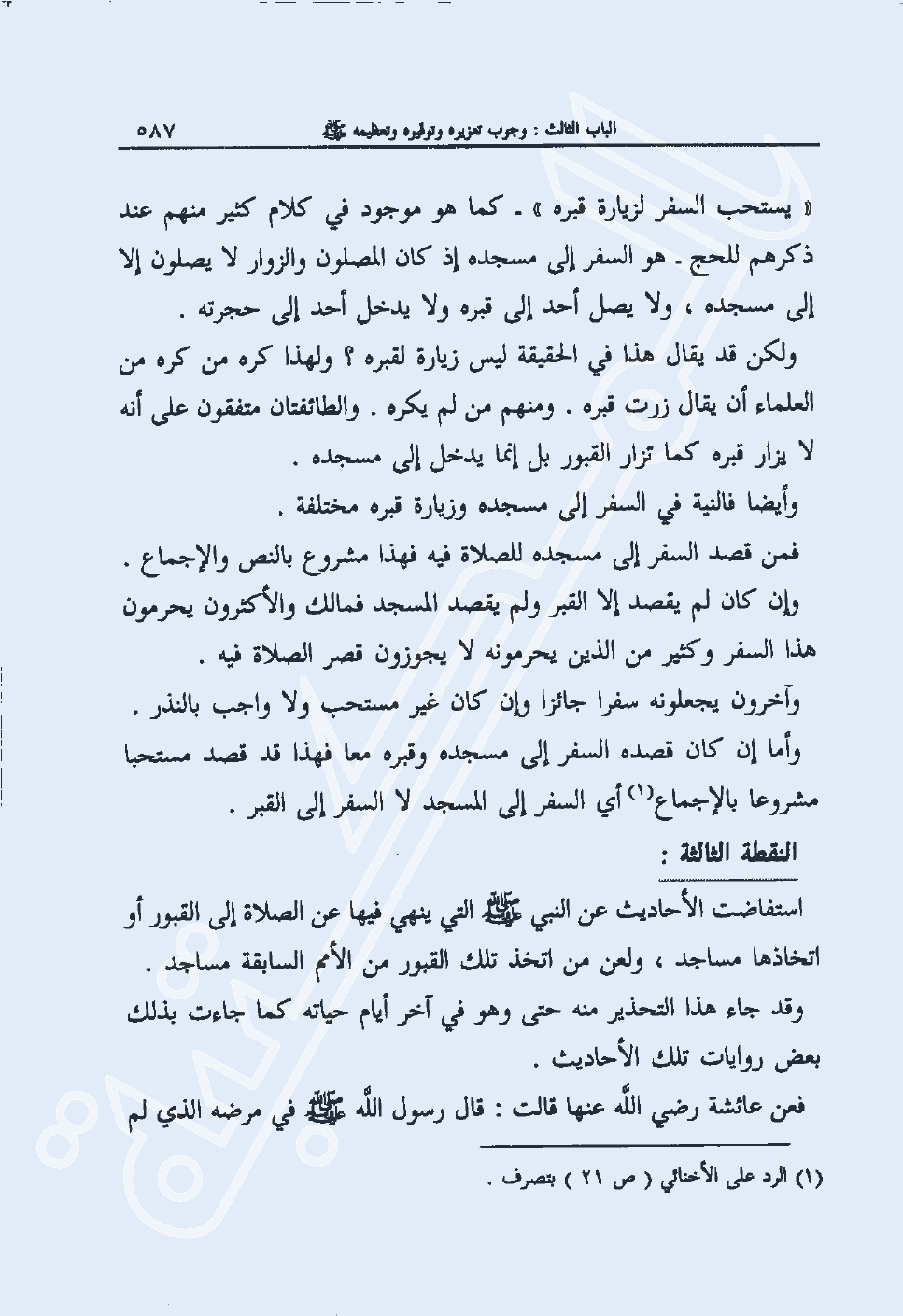 النقطة الثالثة: استفاضت الأحاديث عن النبي صلى الله عليه وسلم التي ينهي فيها عن الصلاة إلى القبور أو اتخاذها مساجد، ولعن من اتخذ تلك القبور من الأم السابقة مساجد. وقد جاء هذا التحذير منه حتى وهو في آخر أيام حياته كما جاءت بذلك بعض روايات تلك الأحاديث.