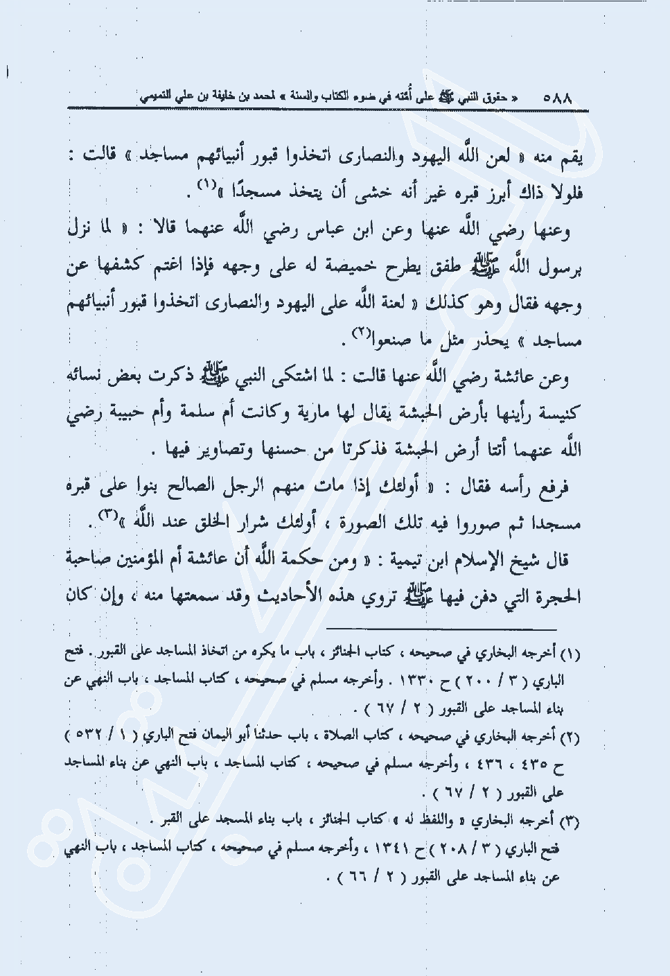 وعن عائشة رضي الله عنها قالت: "لما اشتكى النبي صلى الله عليه وسلم ذكرت بعض نسائه كنيسة رأينها بأرض الحبشة يقال لها مارية وكانت أم سلمة وأم حبيبة رضي الله عنهما أتتا أرض الحبشة فذكرتا من حسنها وتصاوير فيها. فرفع رأسه فقال: "أولئك إذا مات منهم الرجل الصالح بنوا على قبره مسجدا ثم صوروا فيه تلك الصورة، أولئك شرار الخلق عند الله"3. قال شيخ الإسلام ابن تيمية: "ومن حكمة الله أن عائشة أم المؤمنين صاحبة الحجرة التي دفن فيها صلى الله عليه وسلم تروي هذه الأحاديث وقد سمعتها منه، وإن كان