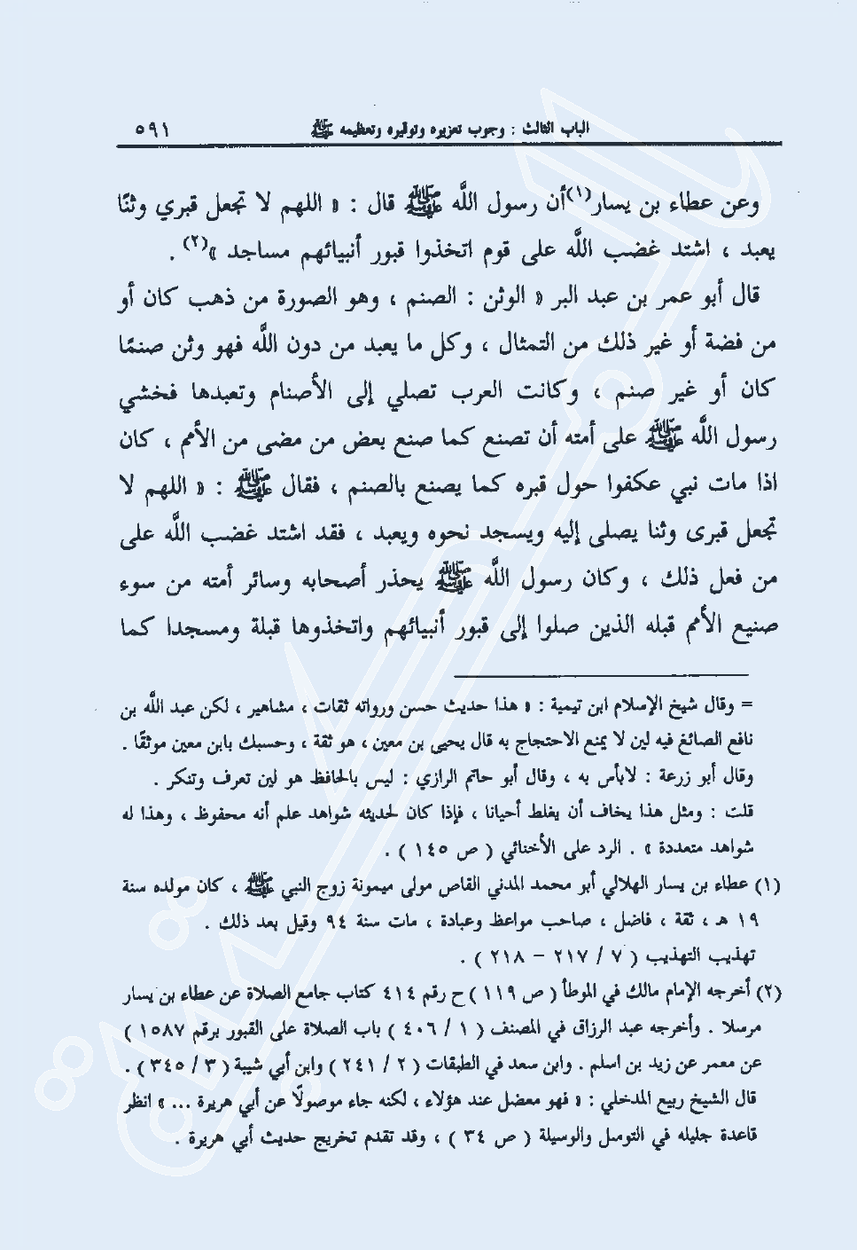 وعن عطاء بن يسار1 أن رسول الله صلى الله عليه وسلم قال: " اللهم لا تجعل قبري وثنا يعبد، اشتد غضب الله على قوم اتخذوا قبور أنبيائهم مساجد" 2.
