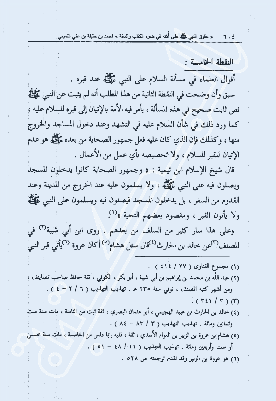 وعلى هذا سار كثير من السلف من بعدهم. روى ابن أبي شيبة2 في المصنف3 عن خالد بن الحارث4 قال سئل هشام5 أكان عروة6 يأتي قبر النبي