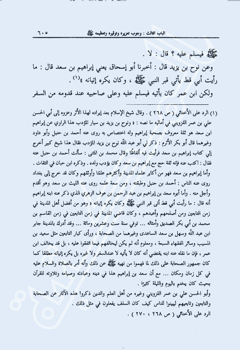 1 الرد على الأخنائي (ص 268) . وقال شيخ الإسلام بعد إيراده لهذا الأثر وعزوه الى أبي الحسن علي بن عمر القزويني في أماليه ما نصه: ونوح بن يزيد بن سيار المؤدب هذا الراوي عن ابراهيم ابن سعد هو ثقة معروف بصحبة ابراهيم وله اختصاص به روى عنه أحمد بن حنبل وأبو داود وغيرهما قال أبو بكر الأثرم: ذكر لي أبو عبد الله نوح بن يزيد المؤدب فقال هذا شيخ كبير أخرج أبي كتاب إبراهيم بن سعد فرأيت فيه ألفاظا وقال محمد بن المثنى: سألت أحمد بن حنبل عنه فقال: اكتب عنه فإنه ثقة حج مع إبراهيم بن سعد وكان يؤدب ولده. وذكره ابن حبان في الثقات. وأما إبراهيم بن سعد فهو من أكابر علماء المدينة وأكثرهم علما وأوثقهم وكان قد خرج الى بغداد روى عنه الناس: أحمد بن حنبل وطبقته، ومن سعة علمه روى عنه الليث بن سعد وهو أقدم وأجل منه. وأما أبوه سعد بن إبراهيم بن عبد الرحمن بن عوف الزهري الذي ذكر عنه ابنه إبراهيم أنه قال: ما رأيت أبي قط أتى قبر النبي صلى الله عليه وسلم وكان يكره إتيانه وهو من أفضل أهل المدينة في زمن التابعين ومن أصلحهم وأعبدهم، وكان قاضي المدينة في زمن التابعين في زمن القاسم بن محمد بن أبي بكر الصديق وأمثاله ... توفي سنة ست وعشرين ومائة ... وقد أدرك بالمدينة جابر ابن عبد الله وسهل بن سعد الساعدى وغيرهما من الصحابة، ورأى كبار التابعين مثل سعيد بن المسيب وسائر الفقهاء السبعة، ومعلوم أنه لم يكن ليخالفهم فيما اتفقوا عليه، بل قد يخالف ابن عمر، فإن ما نقله عنه ابنه يقتضي أنه كان صلى الله عليه وسلم يأتيه لا عند السفر ولا غيره بل يكره إتيانه مطلقا كما كان جمهرر الصحابة على ذلك لما فهموا من نهيه صلى الله عليه وسلم عن ذلك وأنه أمر بالصلاة والسلام عليه في كل زمان ومكان ... مع أن سعد بن إبراهيم هذا في دينه وعبادته وصيامه وتلاوته للقرآن بحيث كان يختم باليوم والليلة كثيرا.
